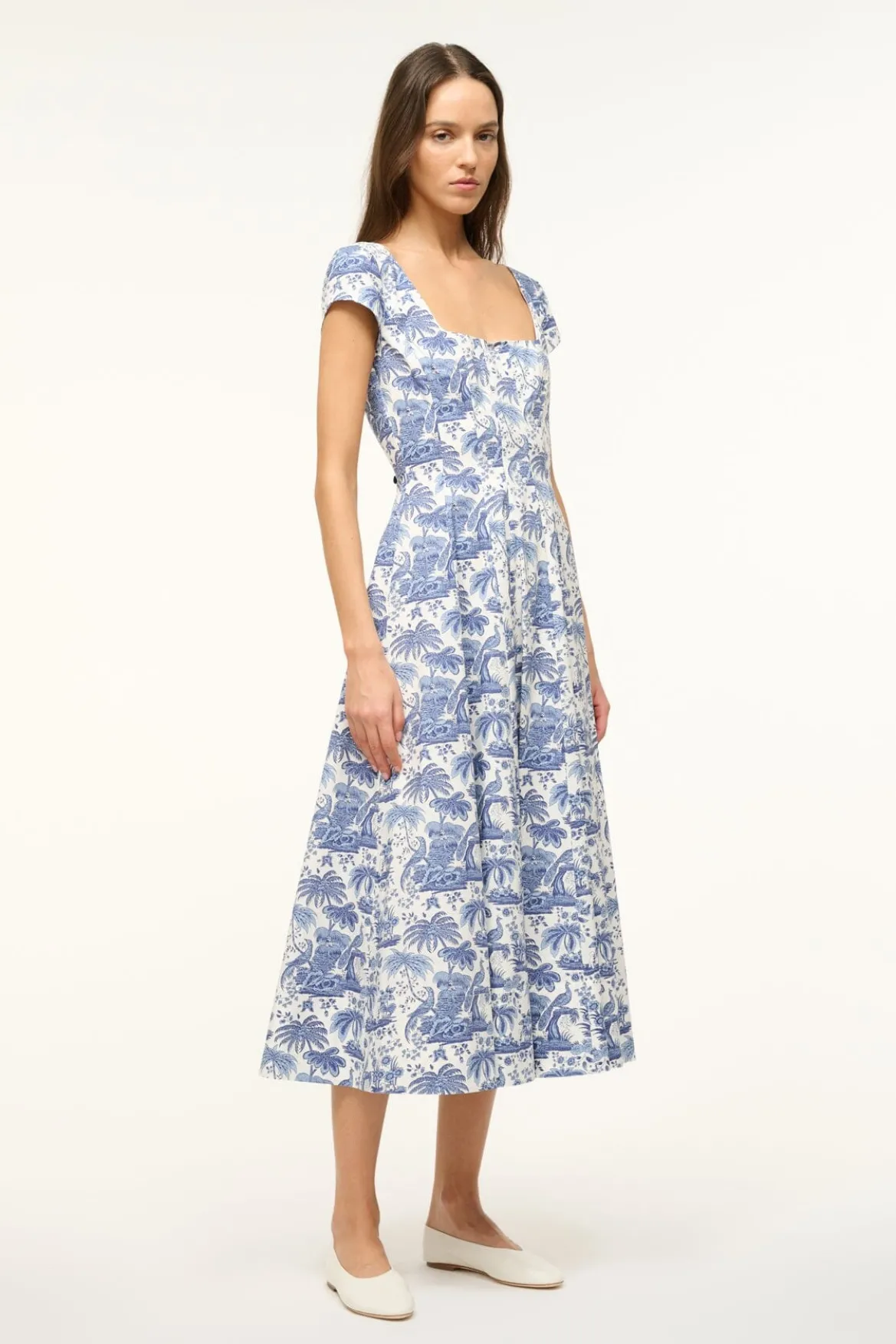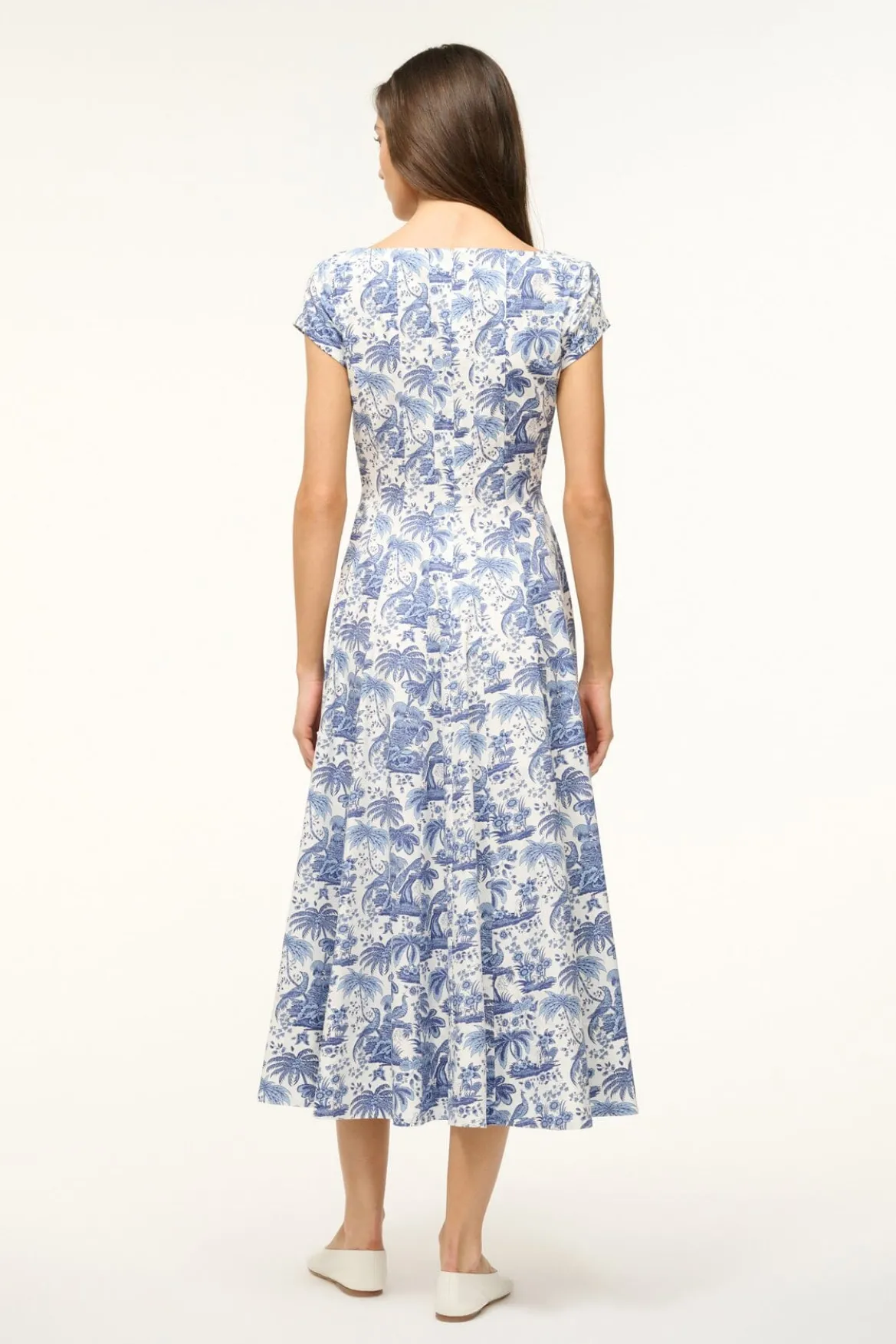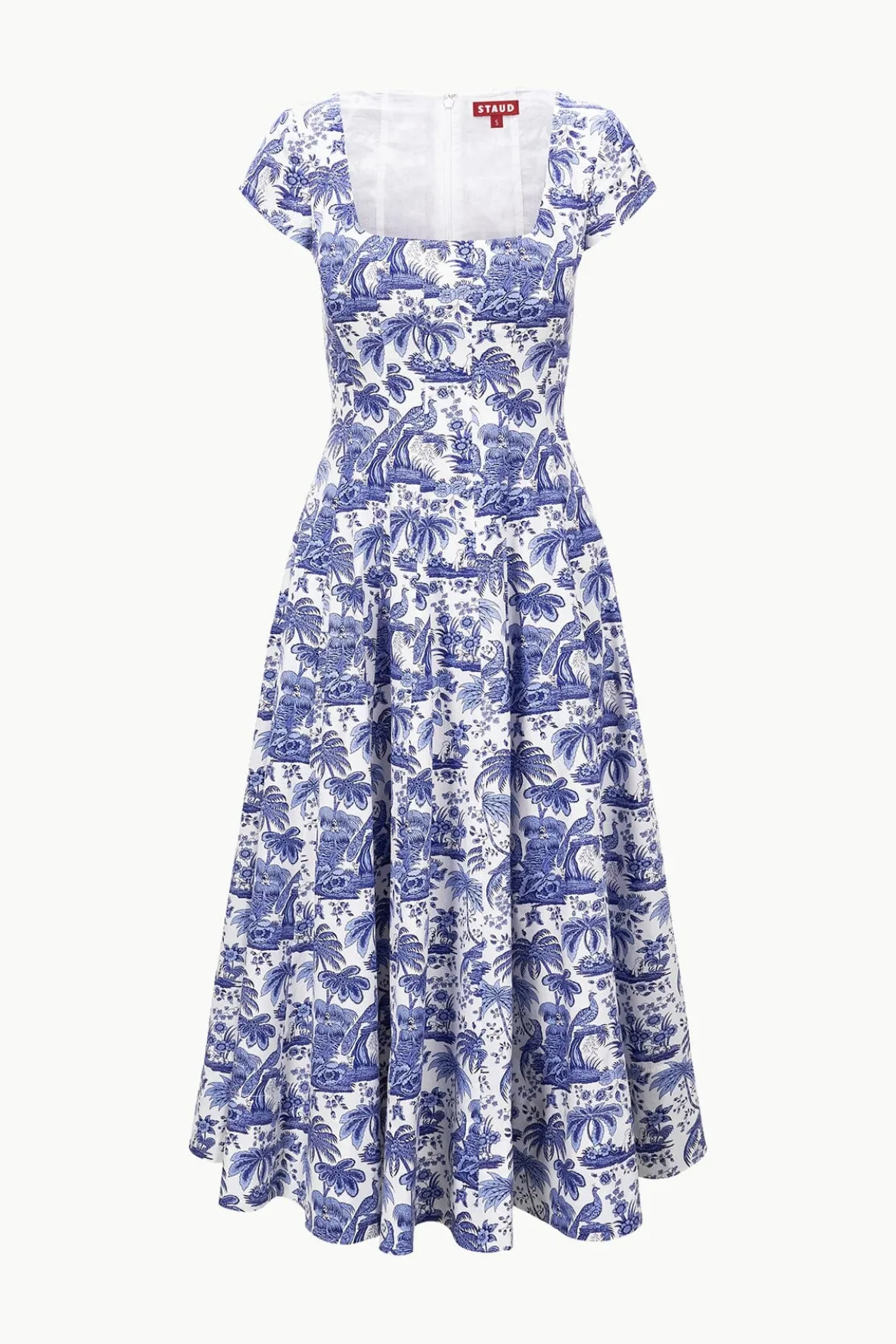 Our classic midi poplin dress in a short sleeve update. This style is fashioned after the STAUD signature Wells Dress and features the same corset-style panel construction and a-line skirt.