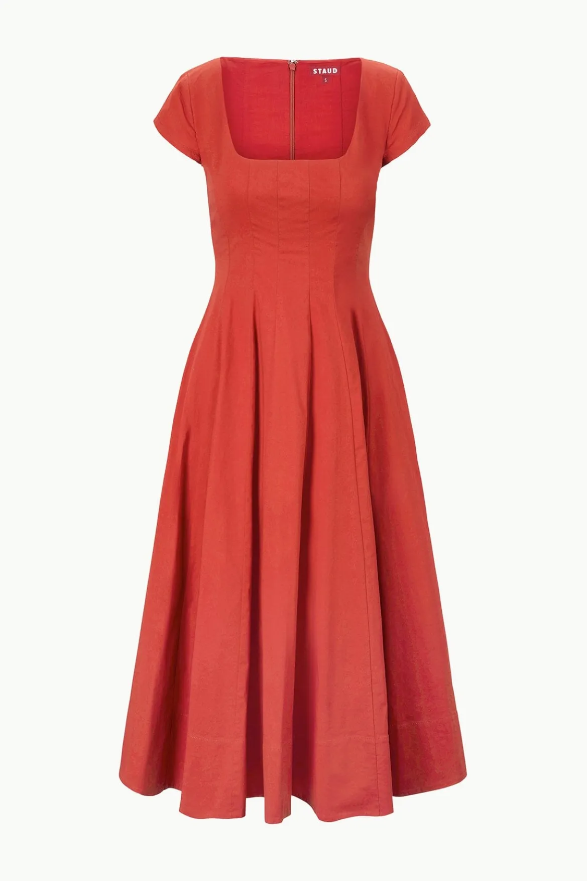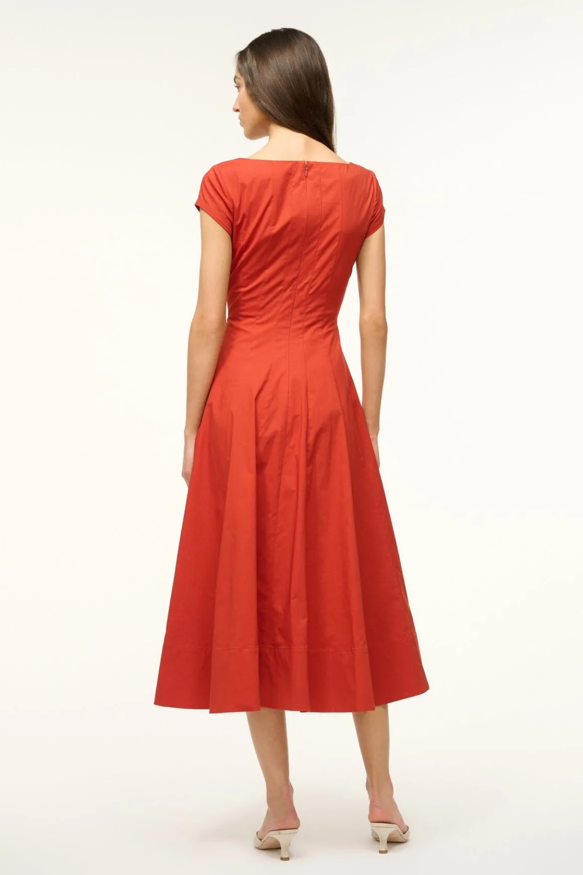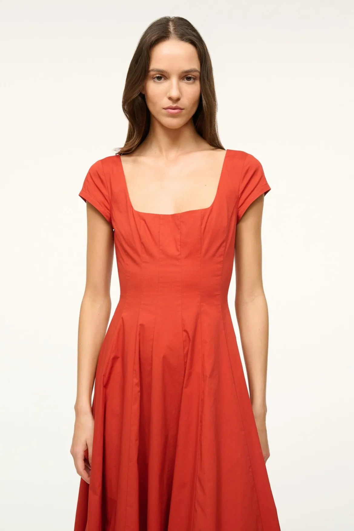 This short sleeve dress is fashioned after the STAUD signature Wells Dress and features the same corset-style panel construction and a-line skirt.