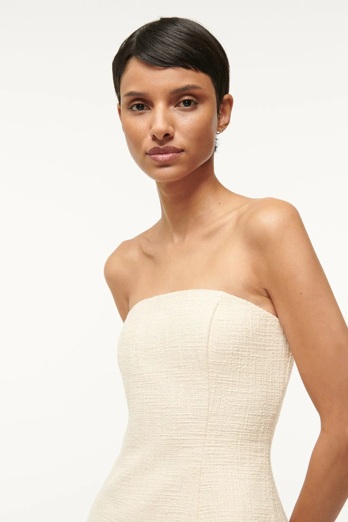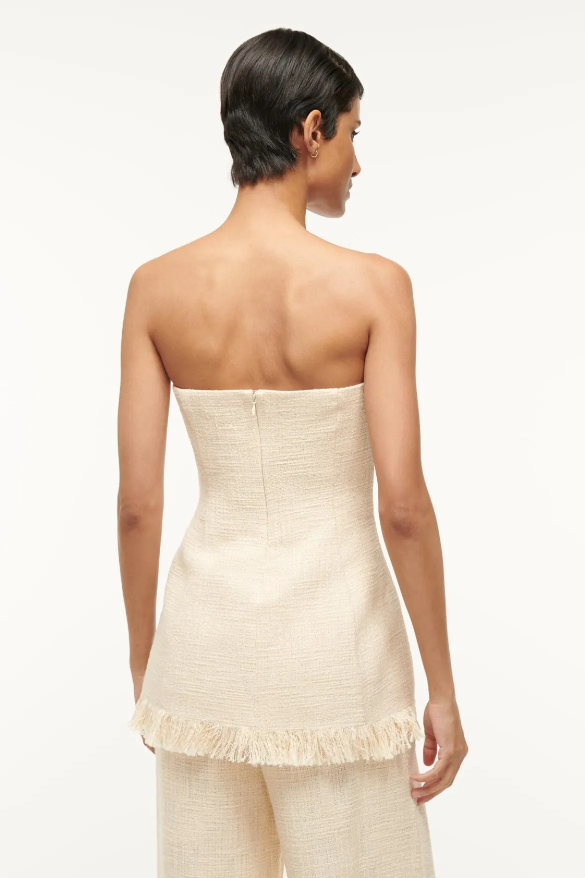 The Silvia Top is a strapless peplum style top with shaping at the hips and a fringe hem. The Silvia can be paired with the Grayson Pant for a matching set.