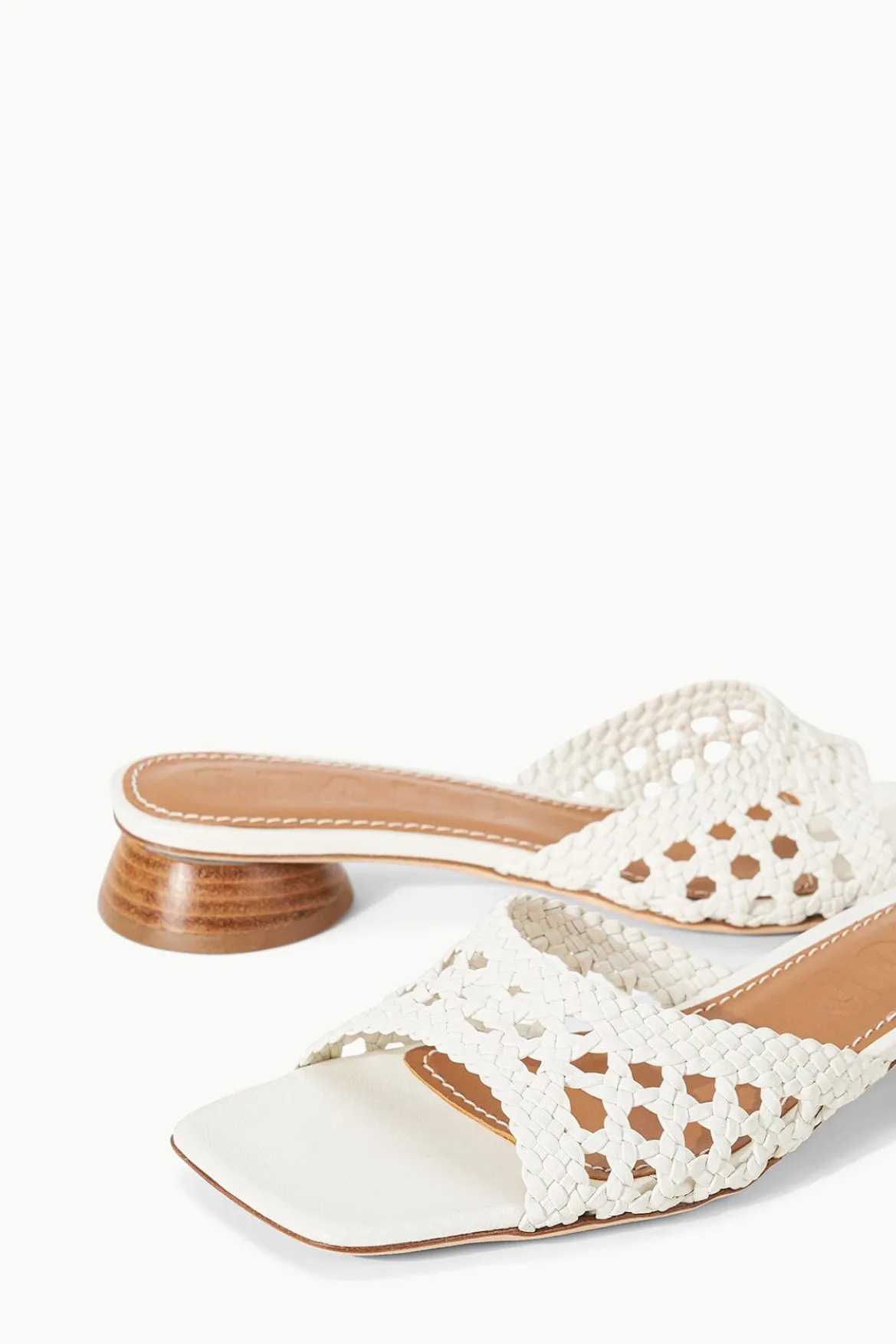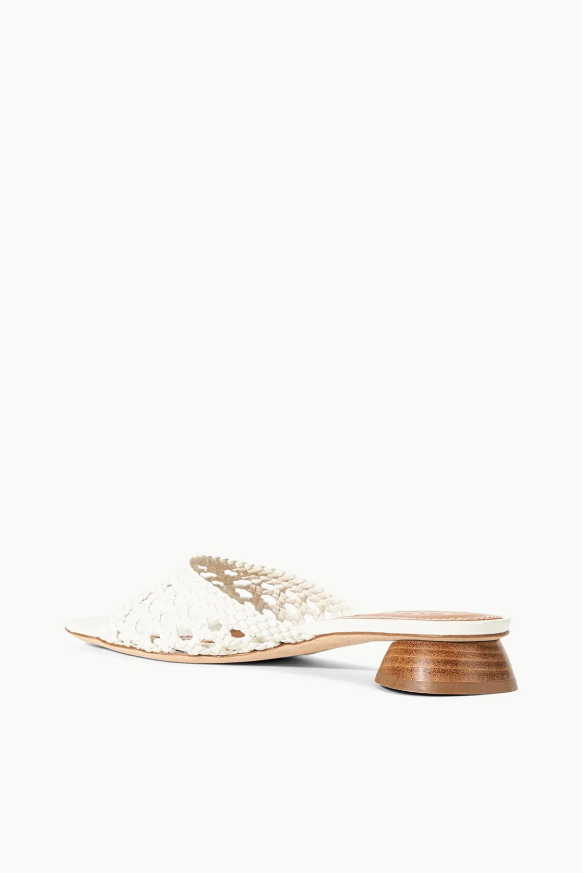 A hand-woven update to the STAUD classic Simone Mule, this style features a wood-covered sculptural low heel and square toe.