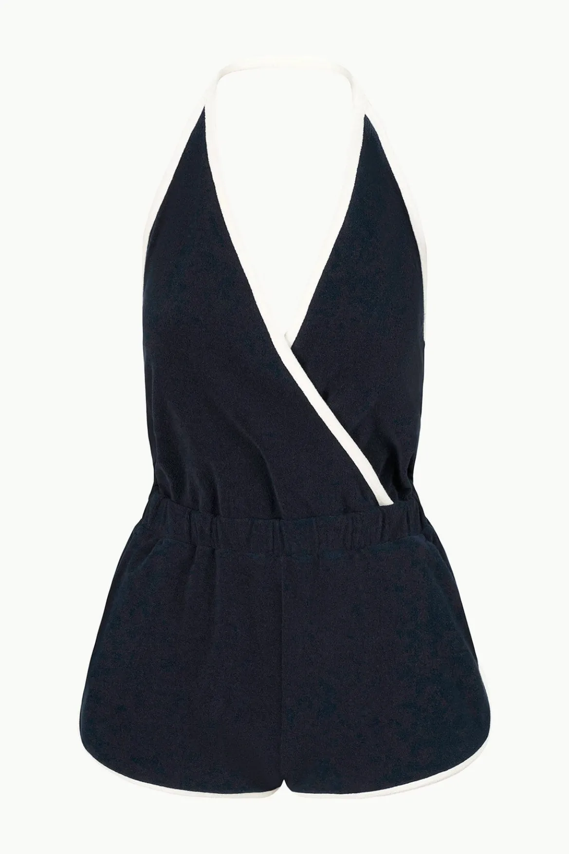 The Sines Romper is a terry cloth swim cover-up, with a halter neckline. This style features a low back and elastic waistband for ease of fit.
