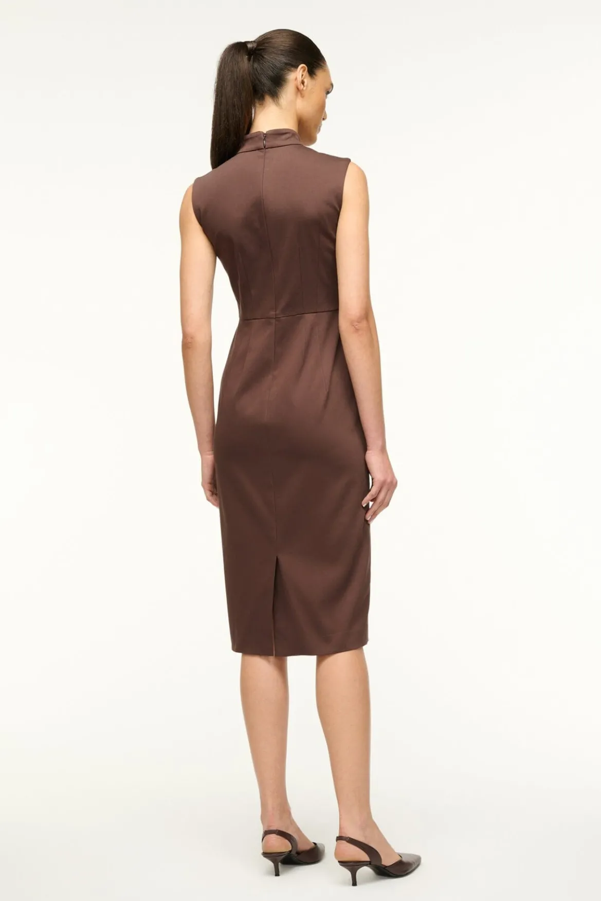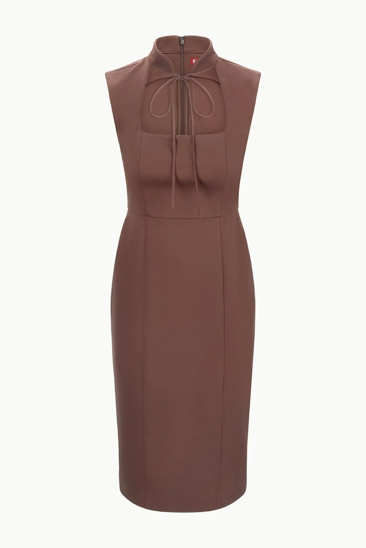 The Mariano Dress is a bustier inspired dress with cut out neckline, mandarin collar, and self ties. This is a slim fitting dress with a center back zipper and slit.
