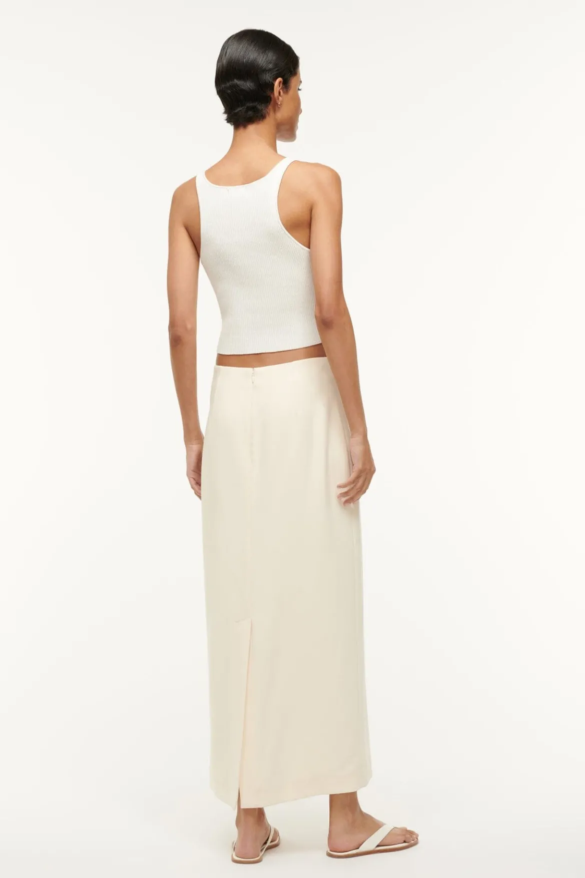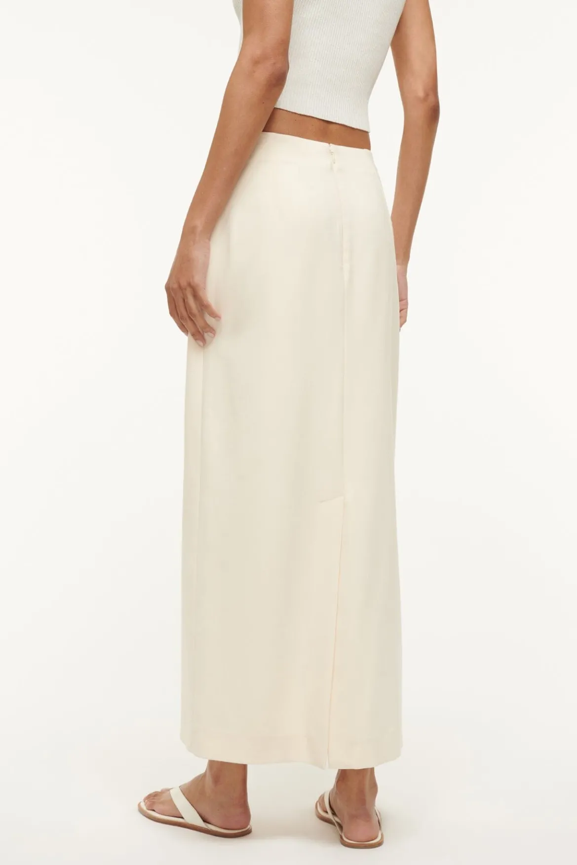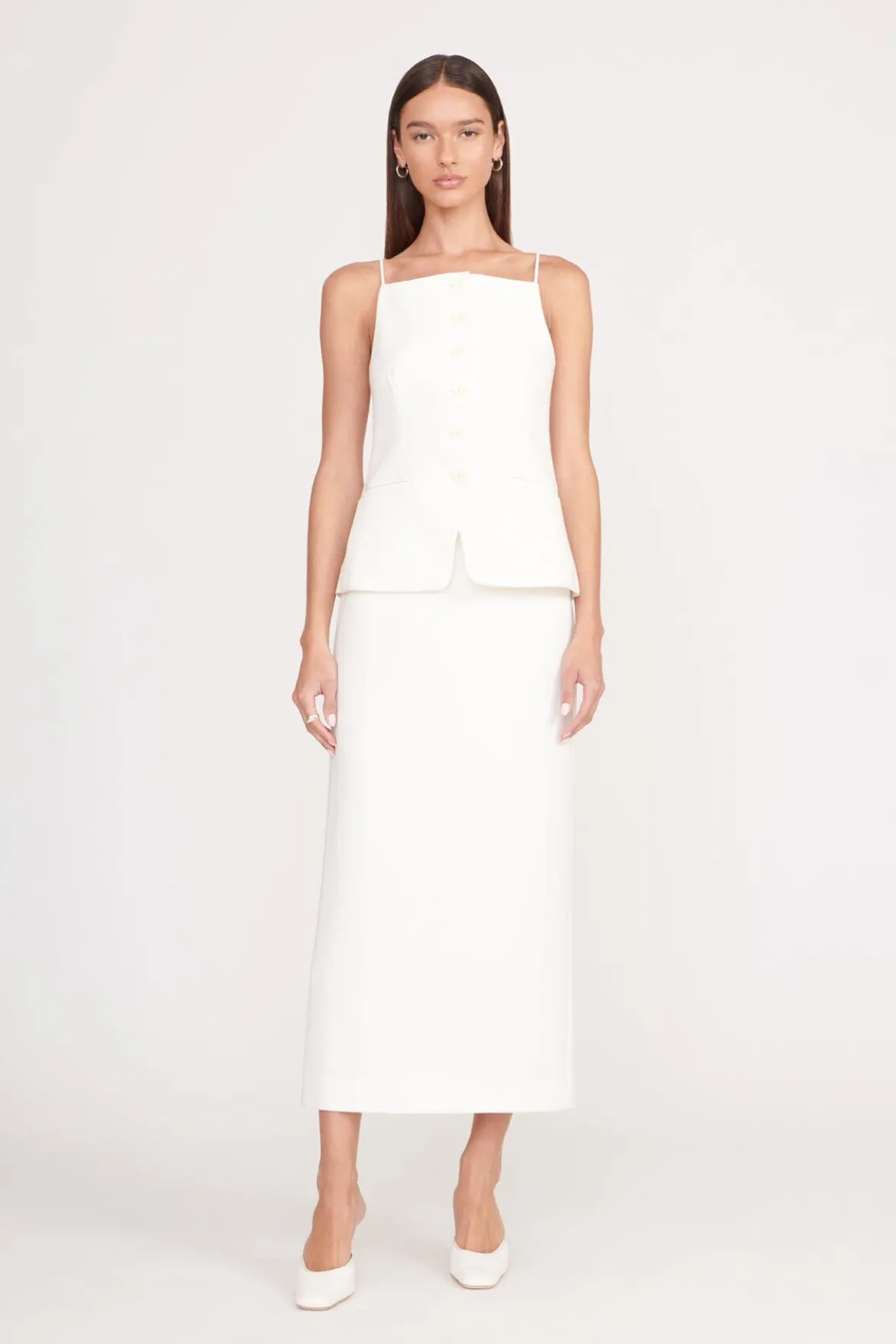 A tailored column skirt, this style features a midi length, double welt pocket details and a back slit.