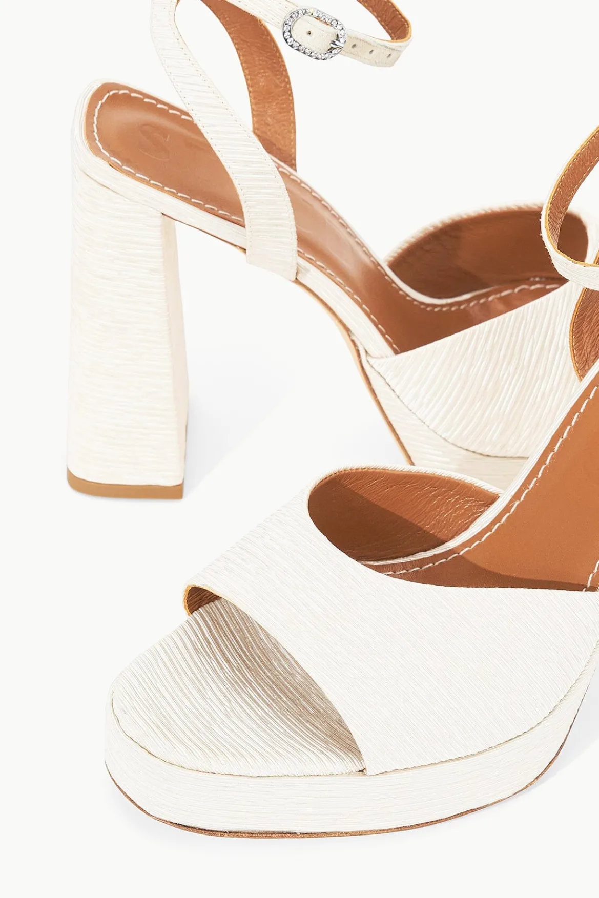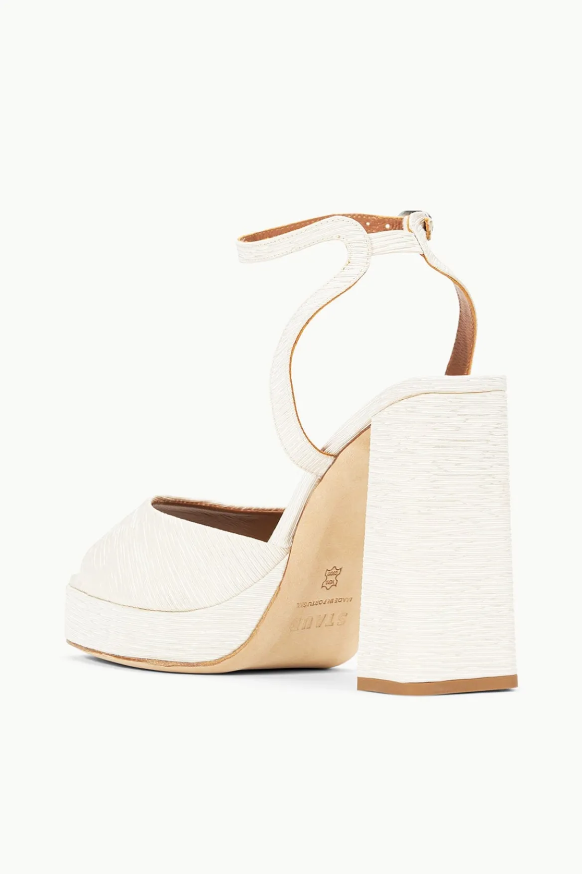 The Solange is an open toe platform heel with an ankle strap and buckle closure.