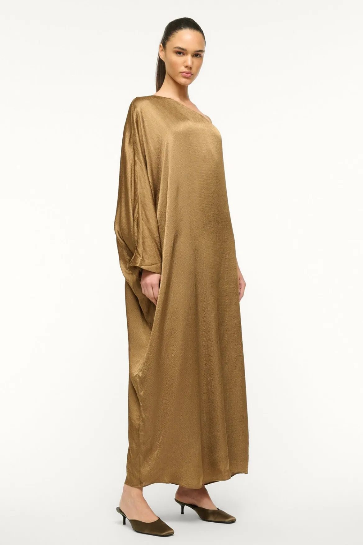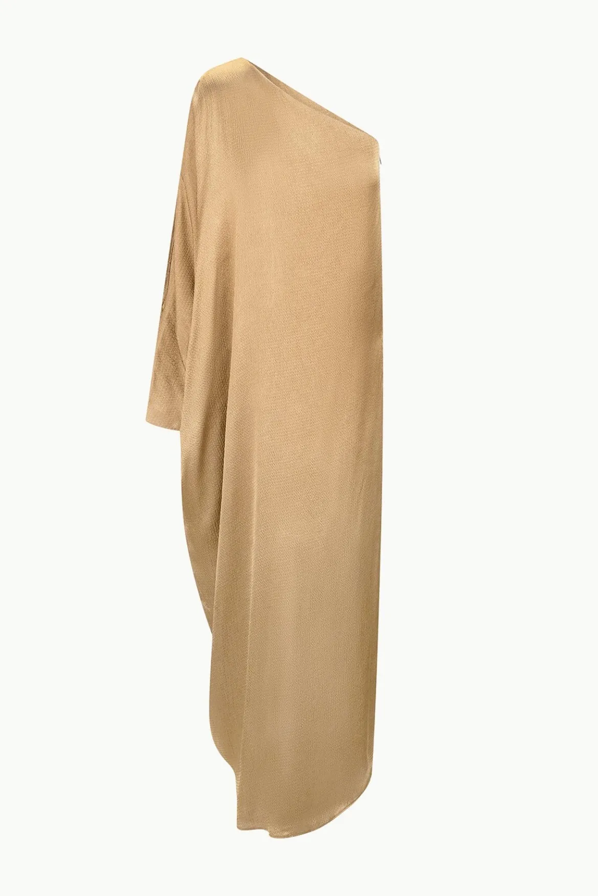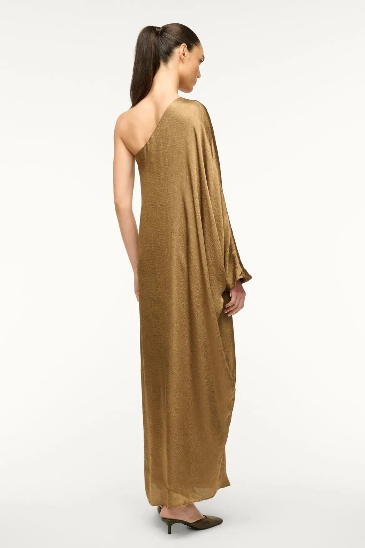 The Sonia Dress is a drapey, one shoulder maxi dress crafted from a golden hammered satin. This style features a hidden zipper closure at the side.