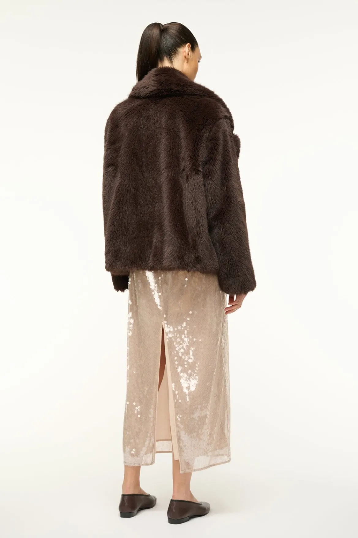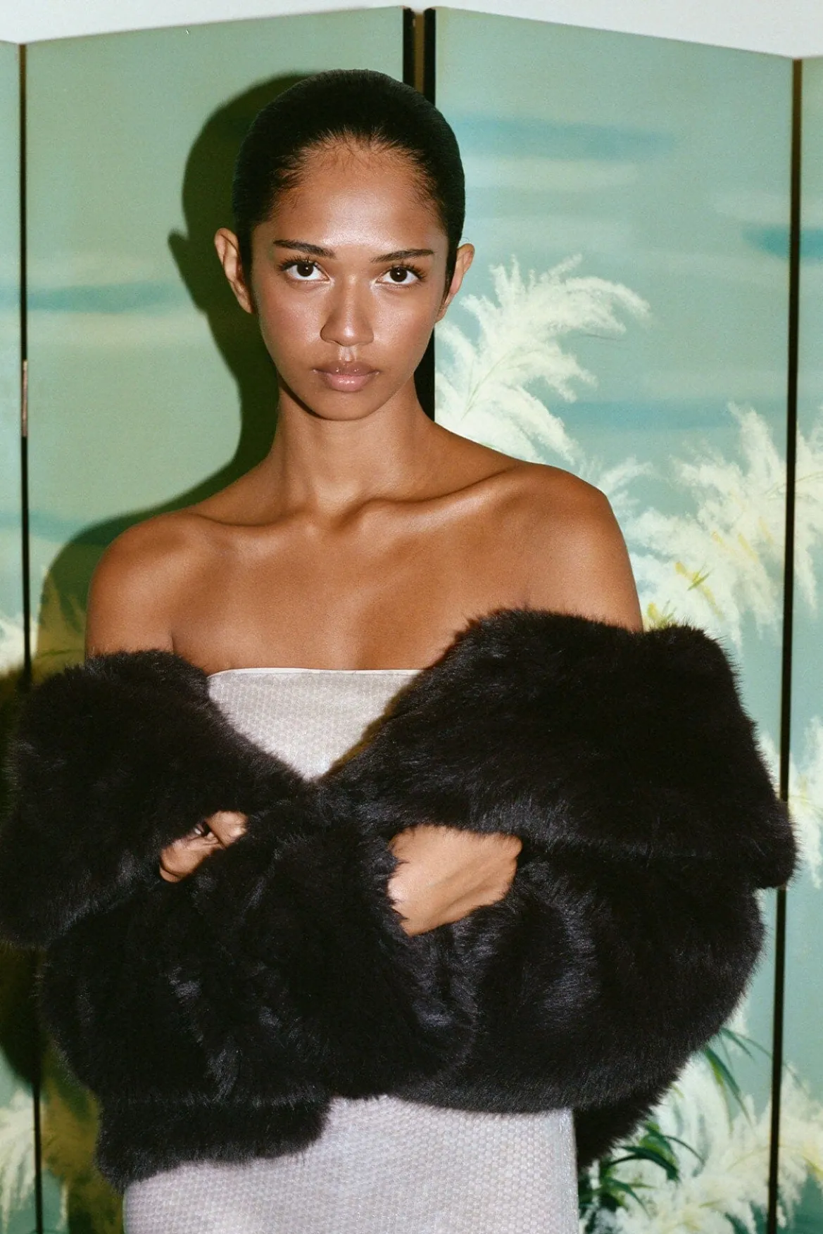 This is an oversized faux fur jacket with notched lapels and side pockets. Wear over any of our occasion dresses to complete your look.