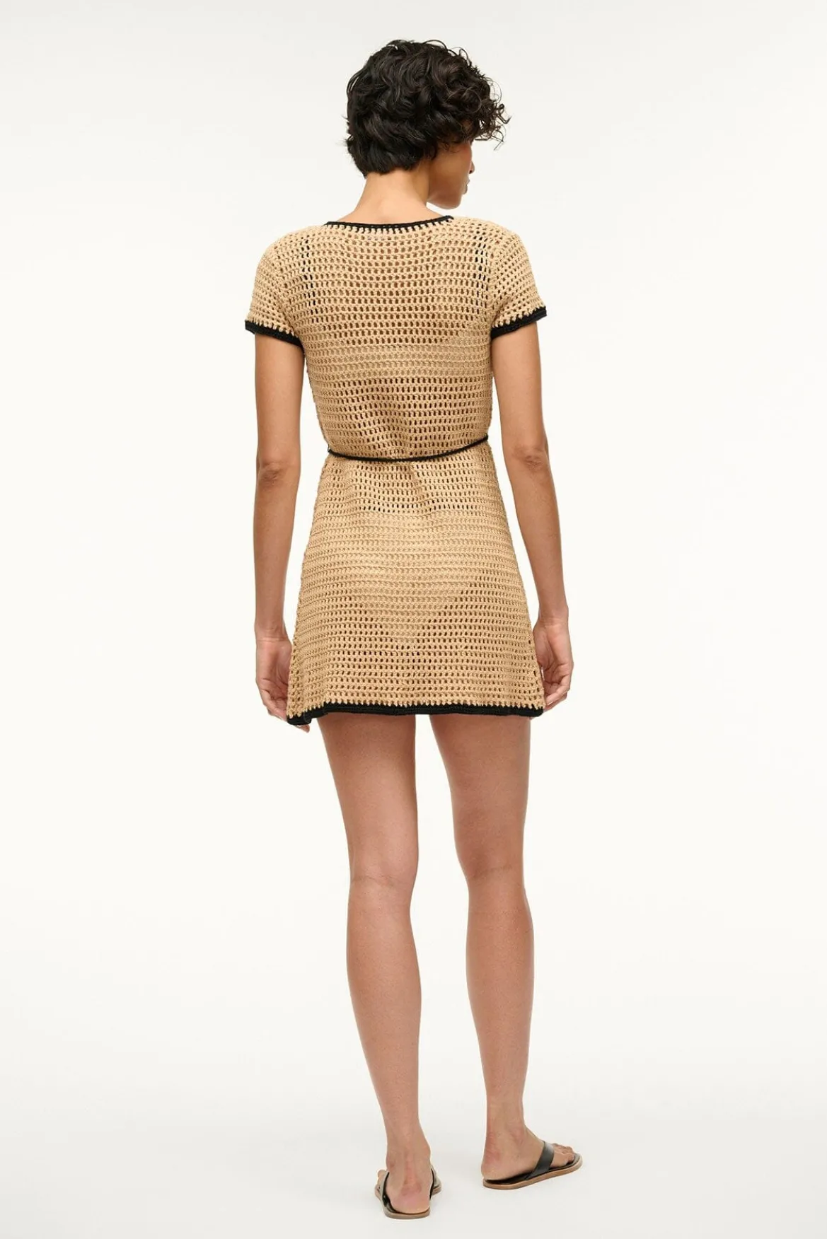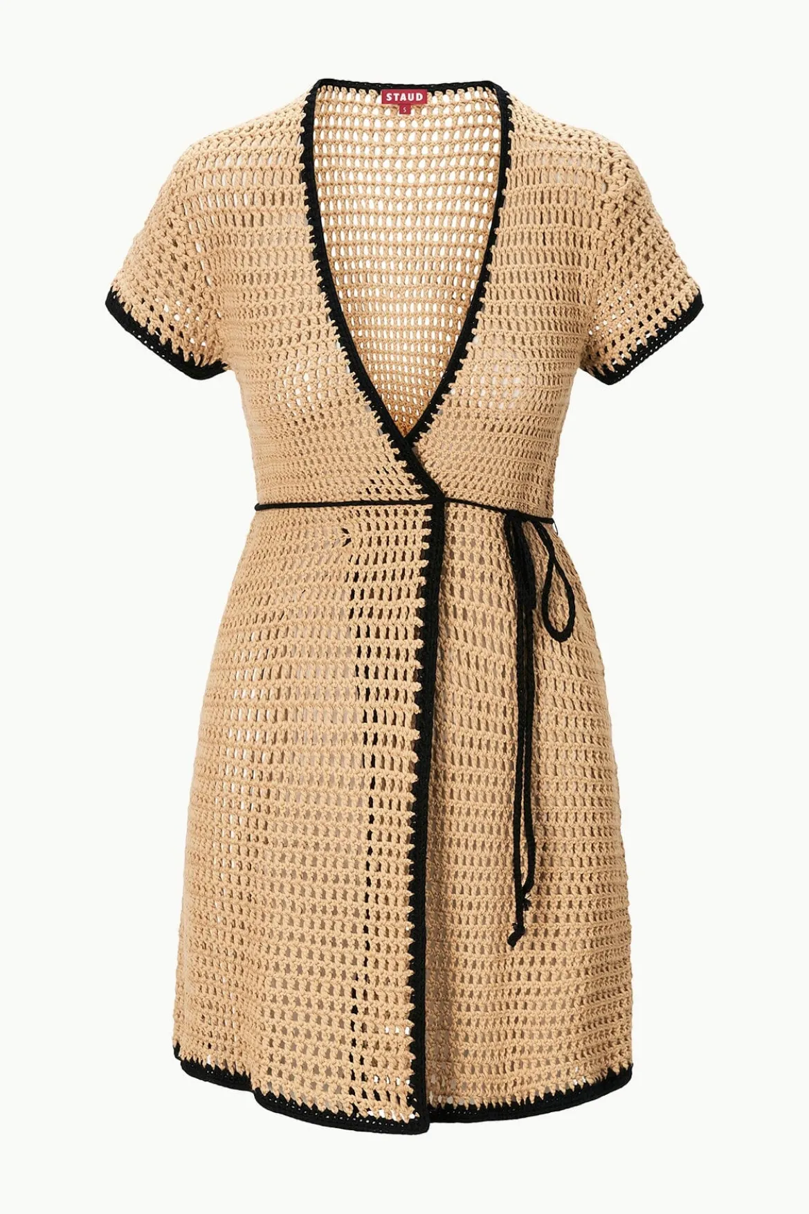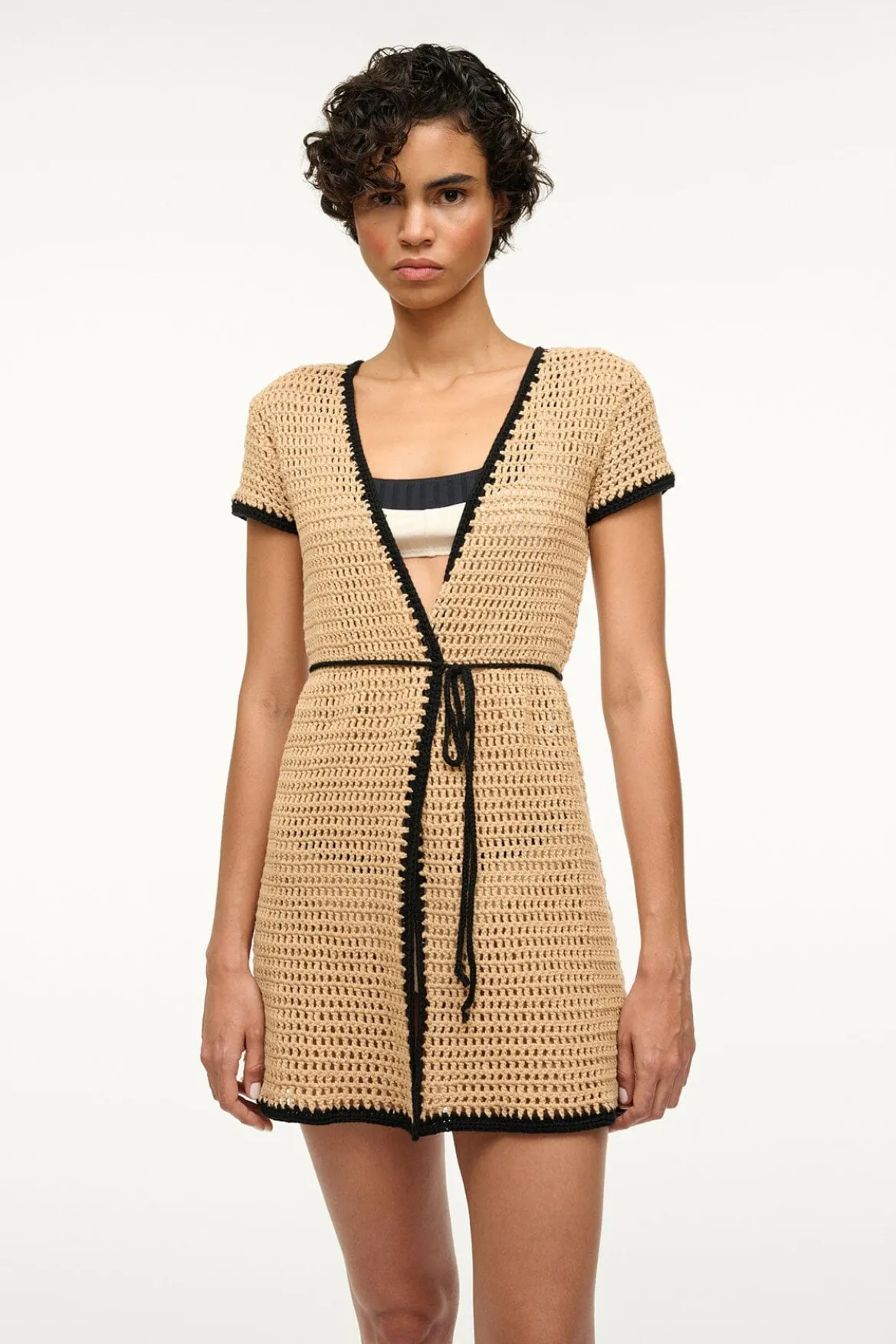 The Spritz is a wrap-style coverup mini dress with a v-neckline and long waist tie. It is craftedusingan open square pointelle stitch and features a contrasting trim.