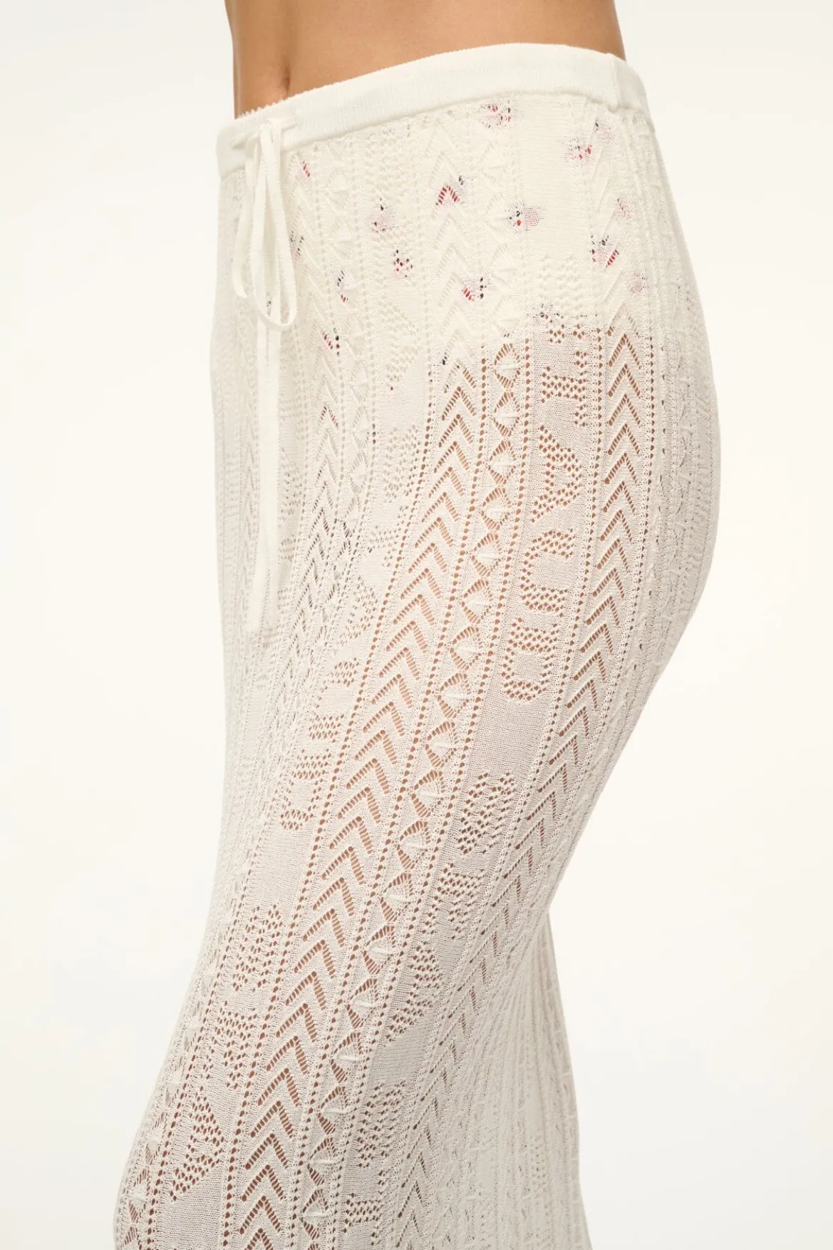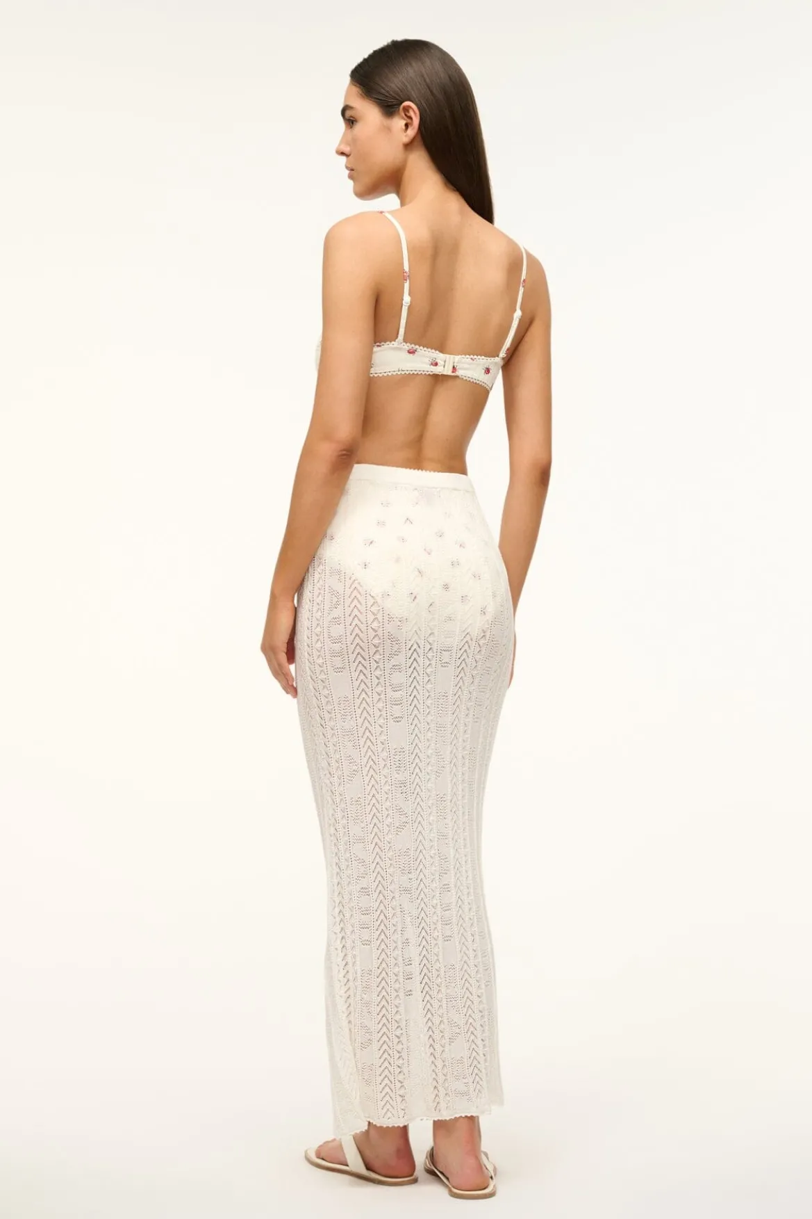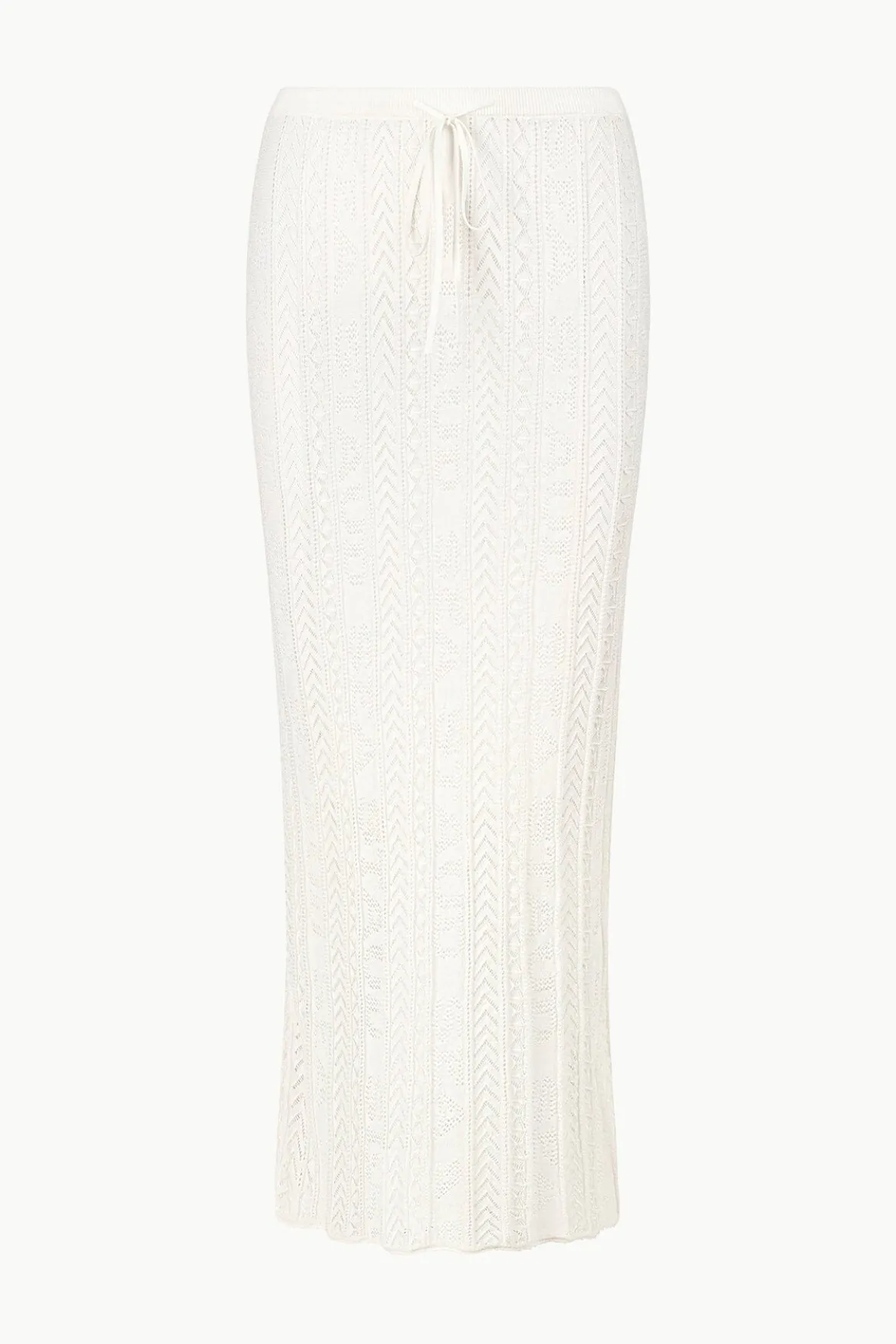 The St. Malo Skirt is a sheer knit cover-up skirt featuring our STAUD SEA knit throughout. This style is a pull-on skirt with a drawstring waist.