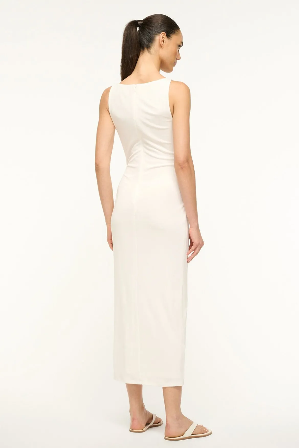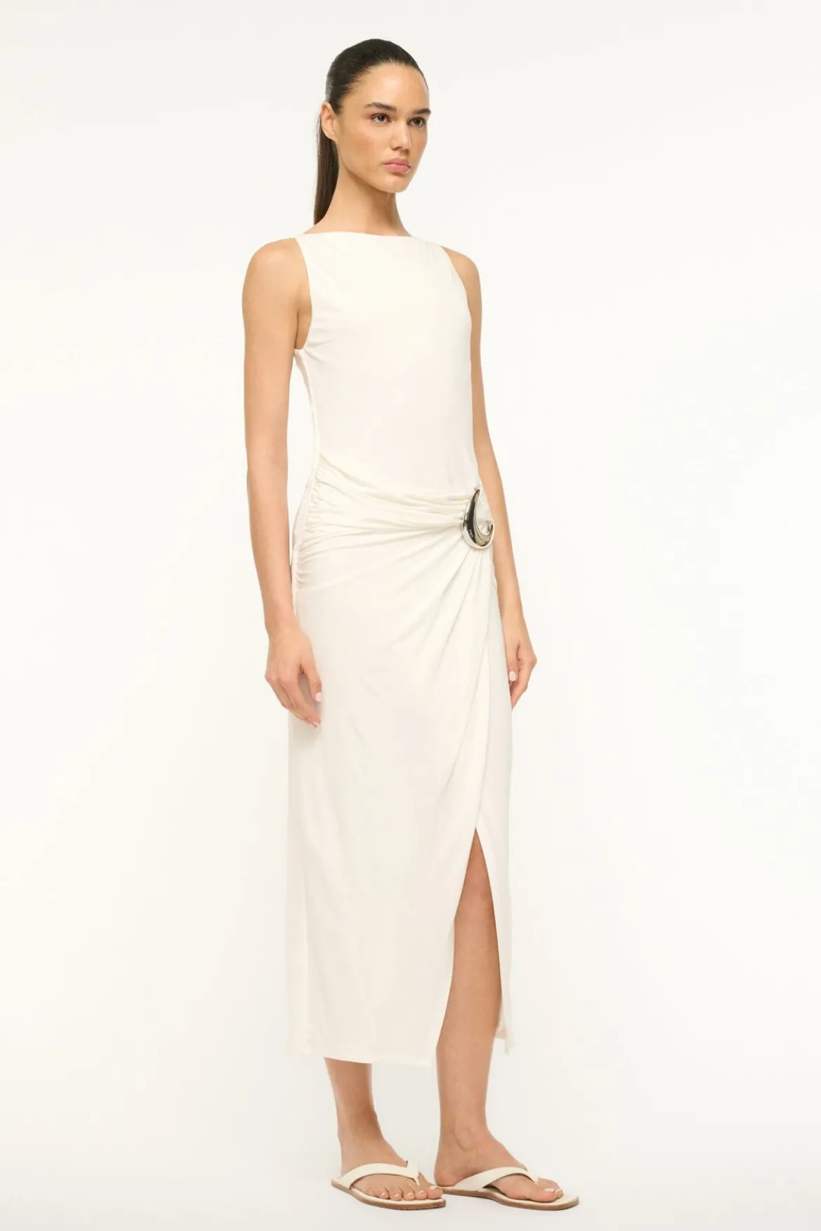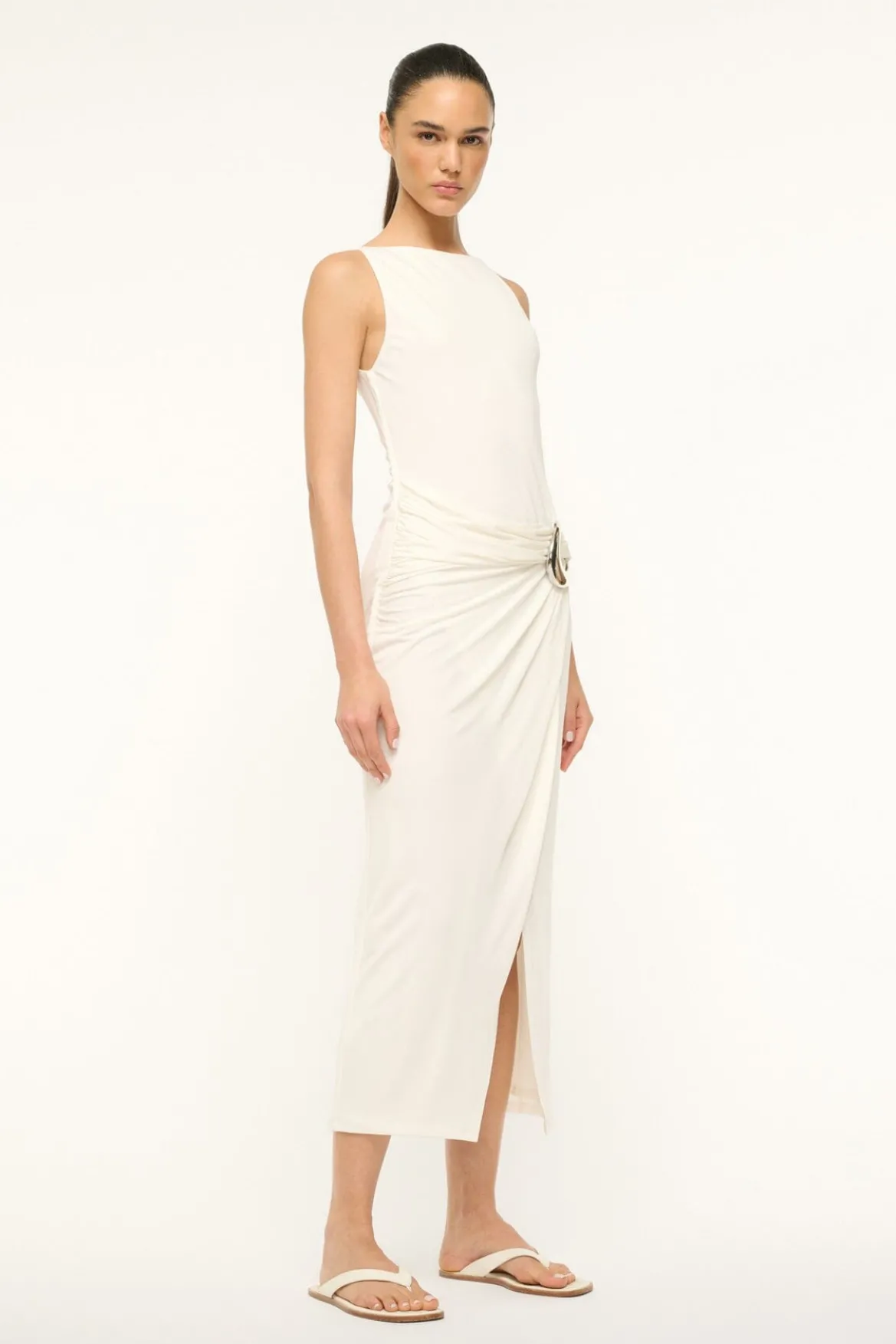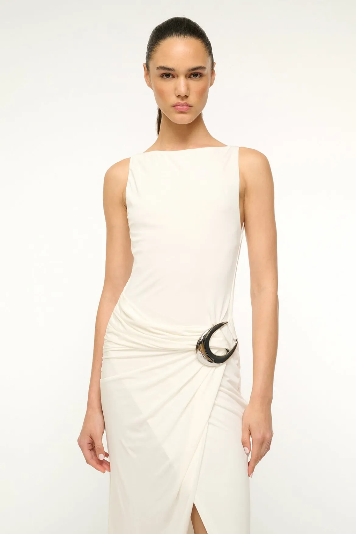 A sleeveless boatneck jersey dress, the Talia features a wrap skirt and oversized custom moon buckle hardware detail gathered at the waist.