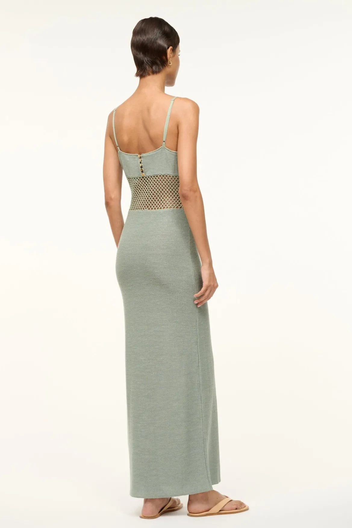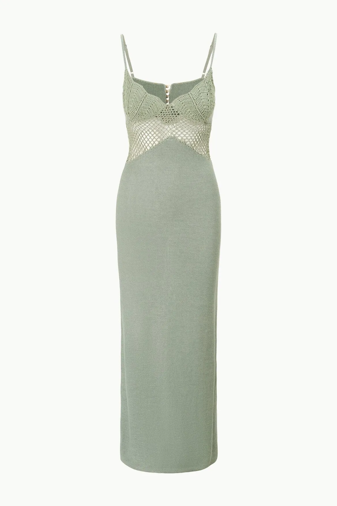 The Tara Dress is a sleek, crochet maxi dress with spaghetti straps and sheer crochet panels. The dress features a fitted bodice and skirt, with shell cup detailing at the bust.