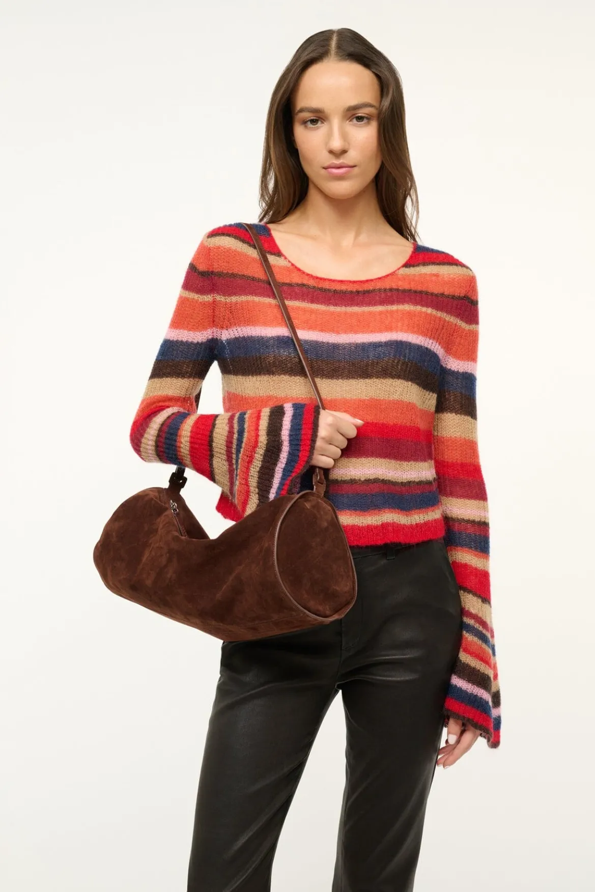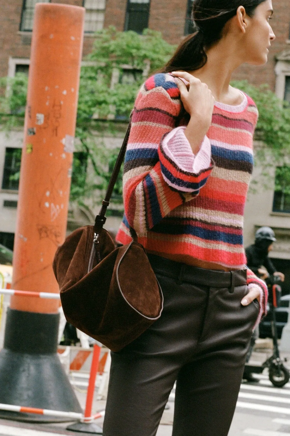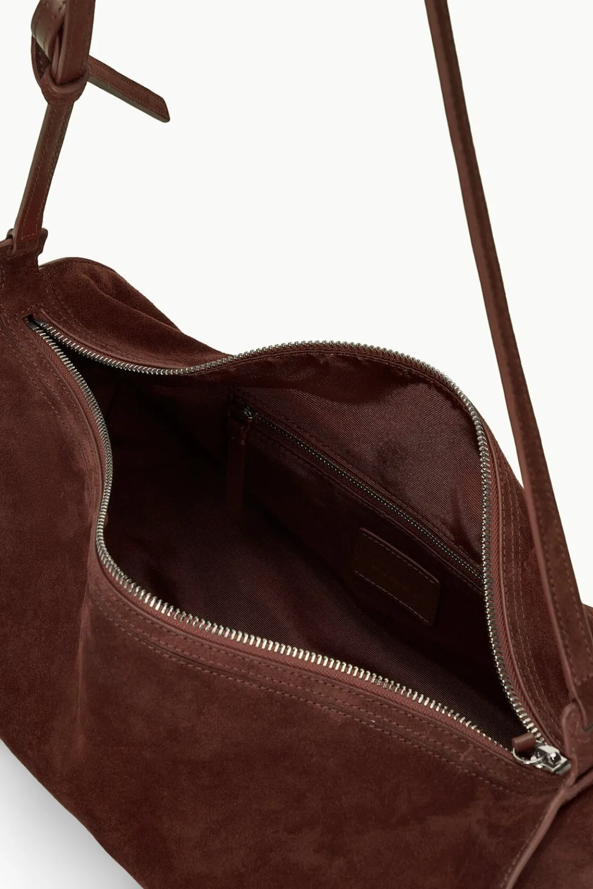 A soft suede shoulder bag with adjustable shoulder strap, the Taru can be adjusted to also be worn crossbody. This style features a zip closure and interior zip pocket.