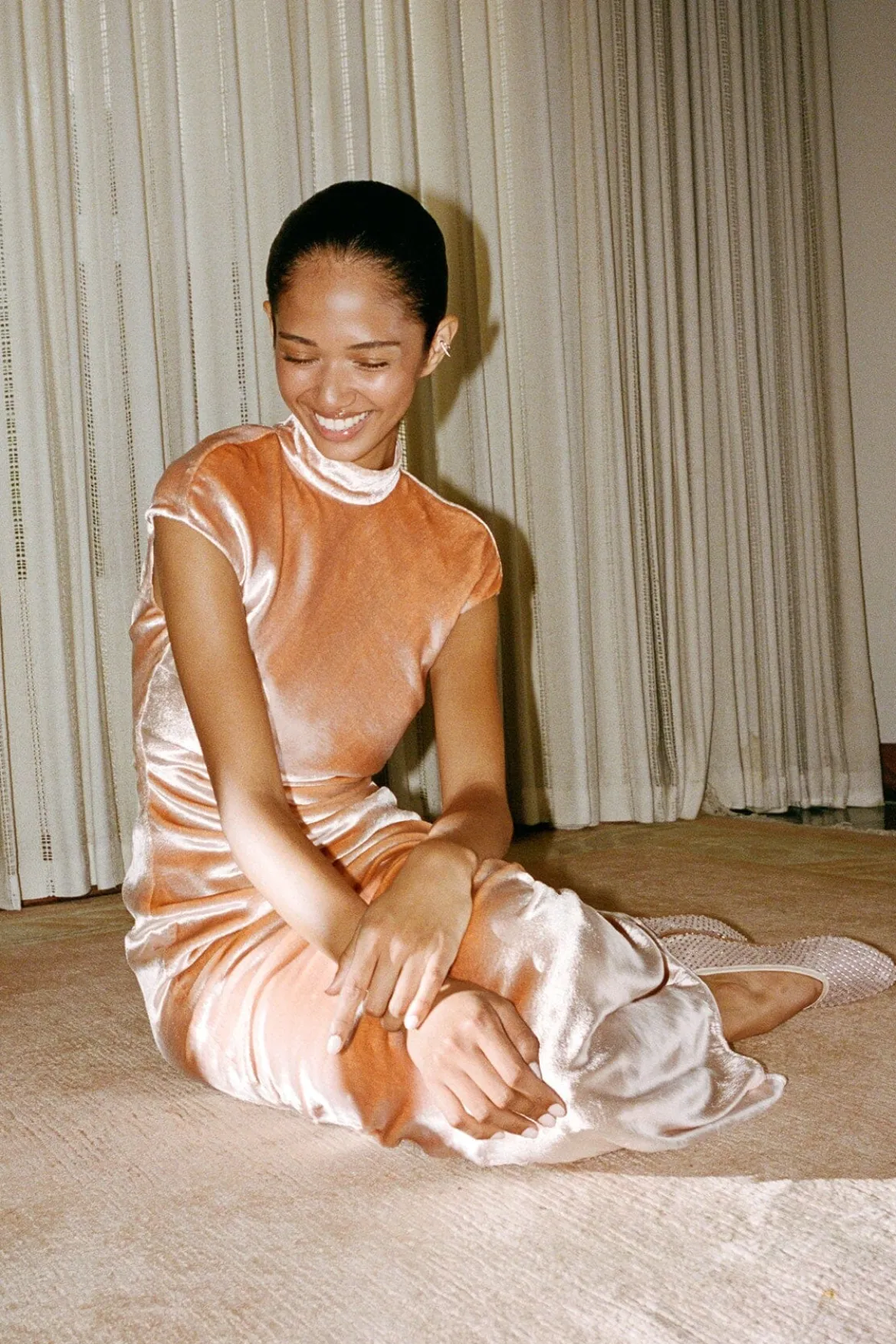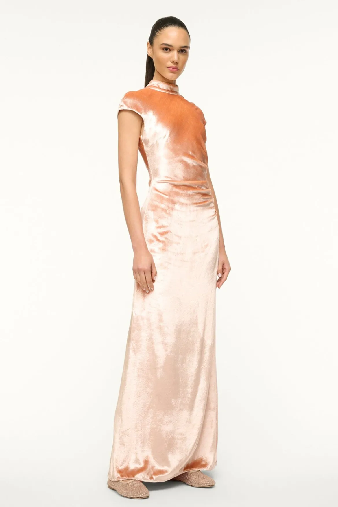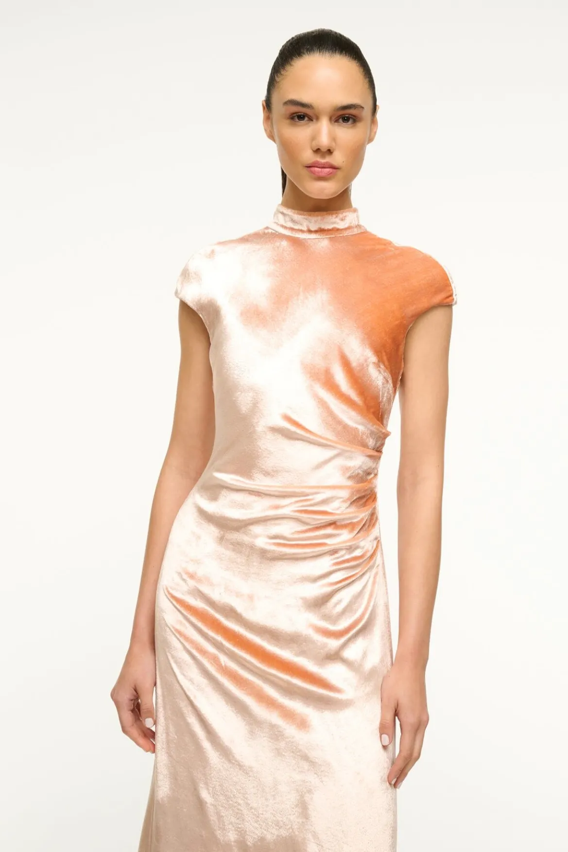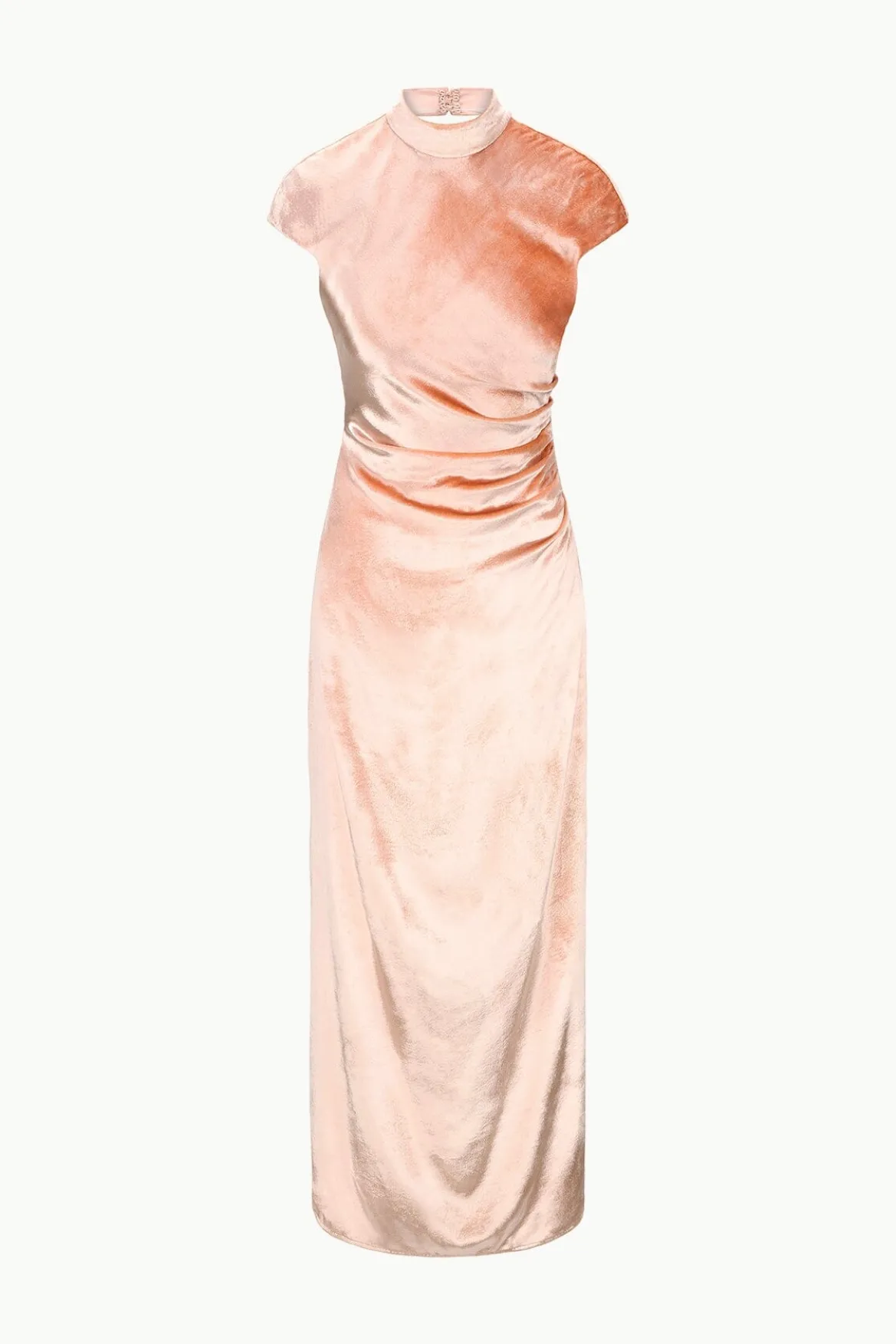 The Tina Dress is a mock neck gown with cap sleeves, asymmetric draping at the waist and an open back.