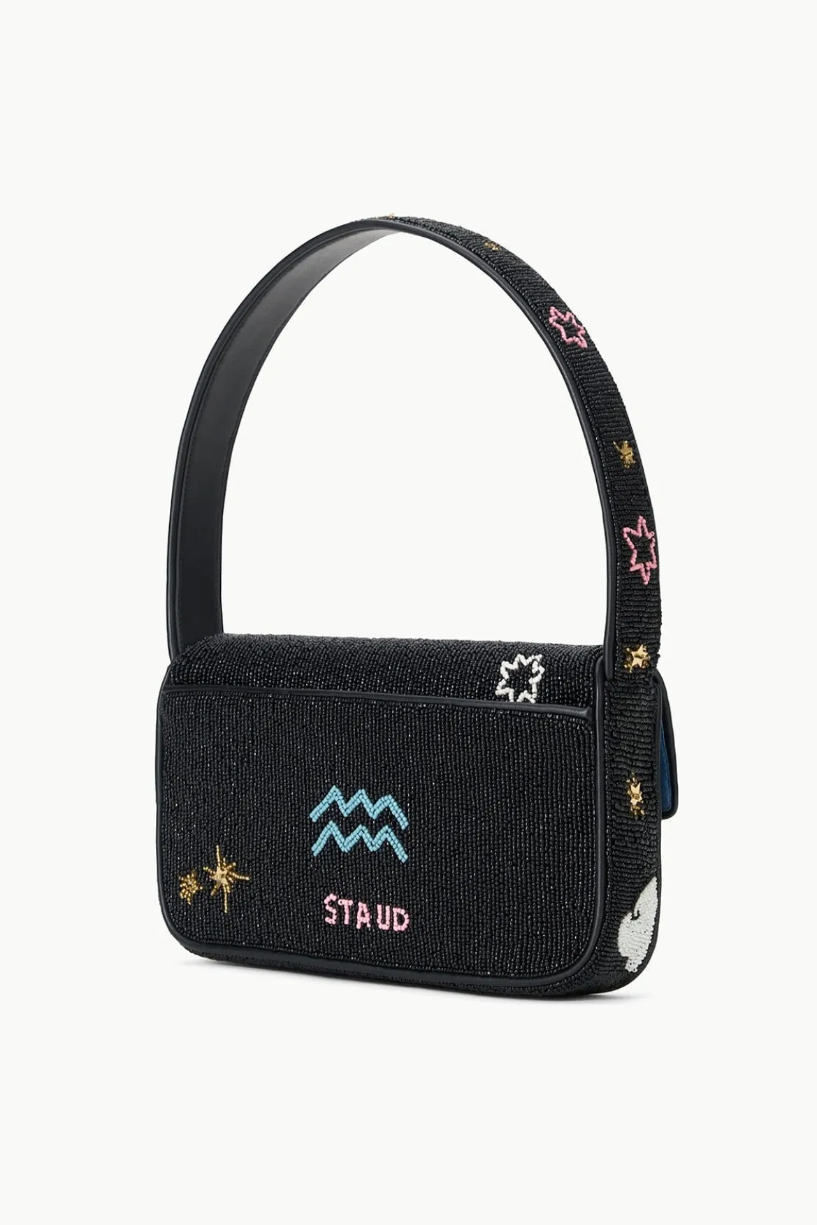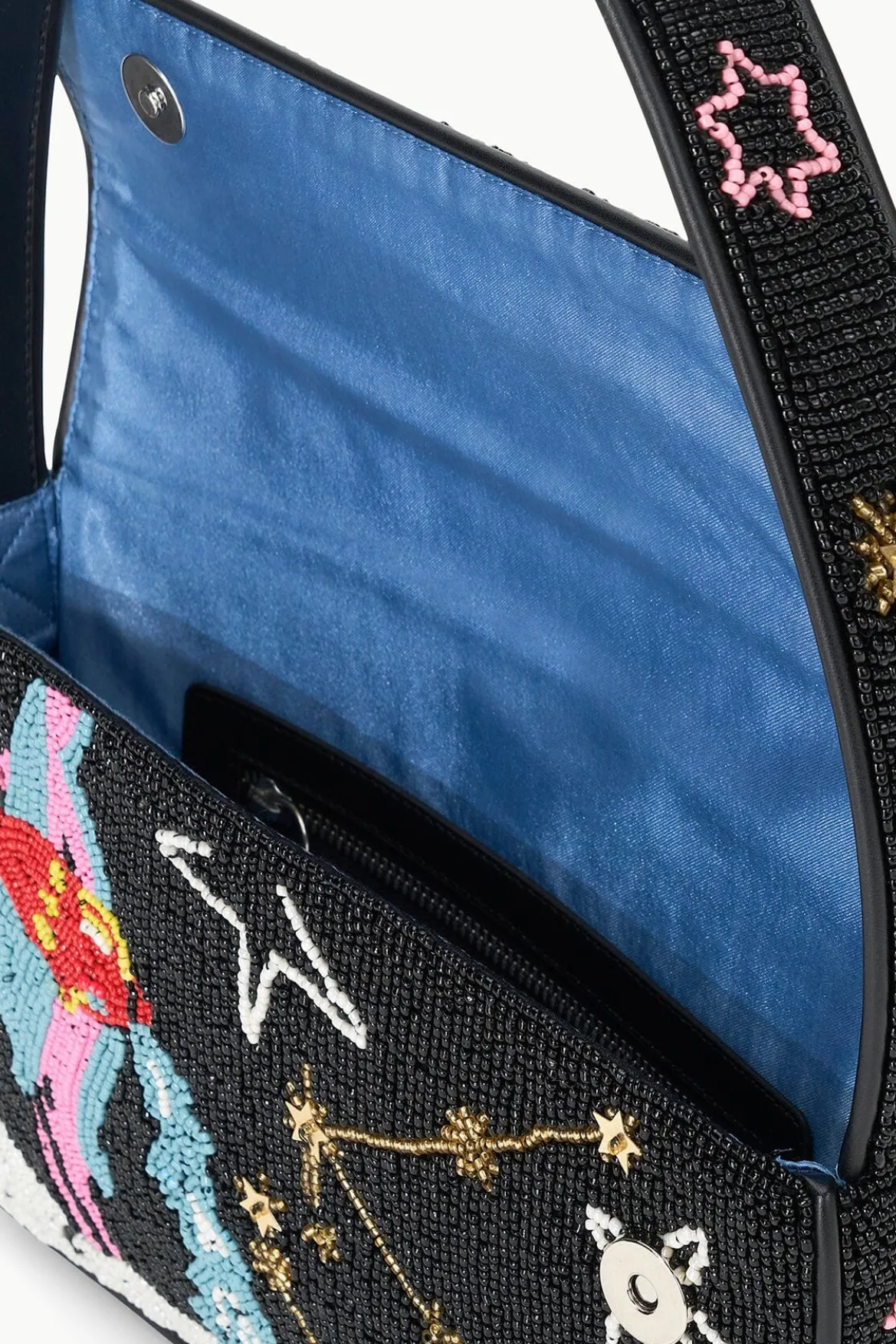 Twelve new beaded Tommy bags inspired by the star signs of the zodiac. This style is hand beaded and features vegan leather piping, a magnetic snap closureand has a pocket on the back.