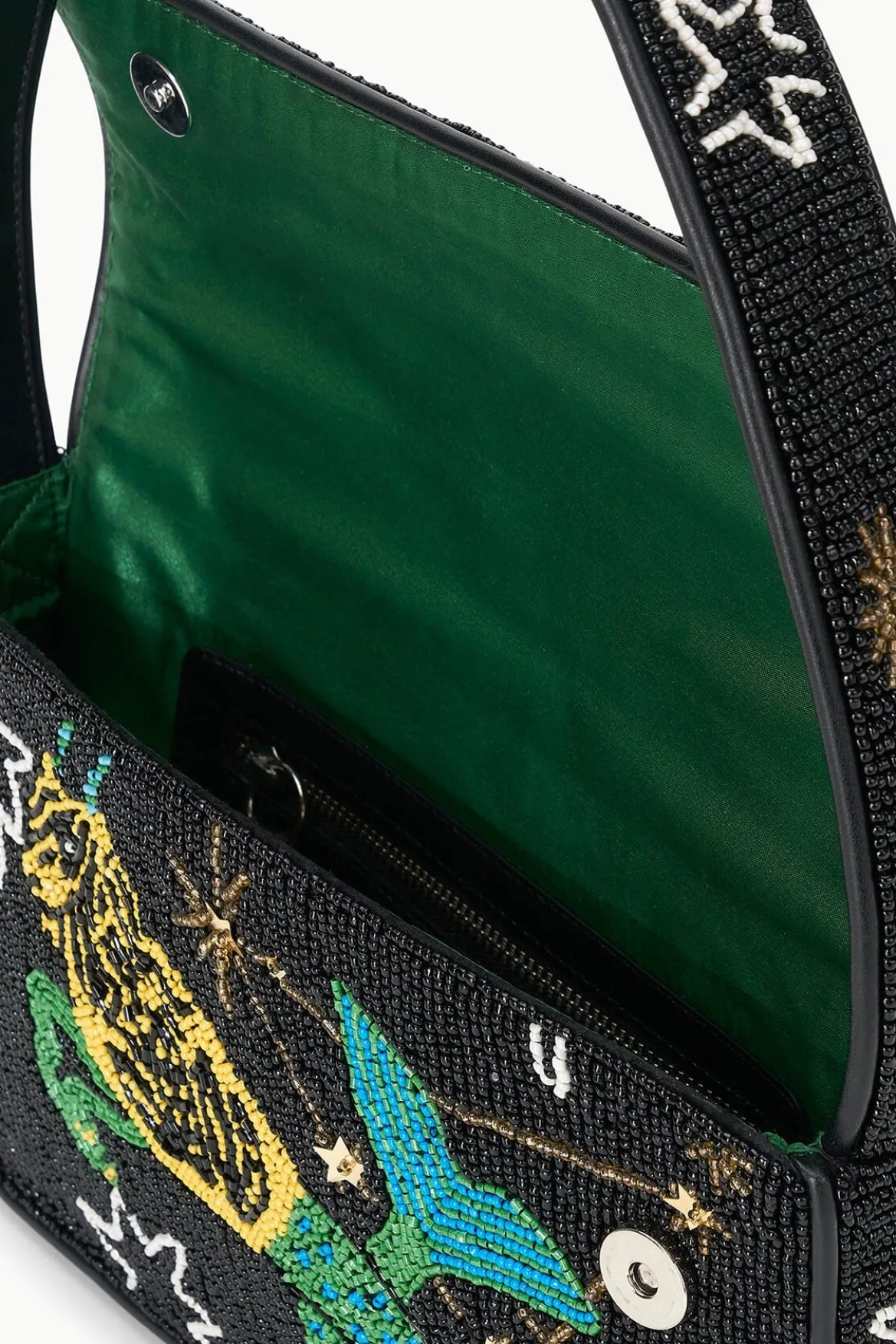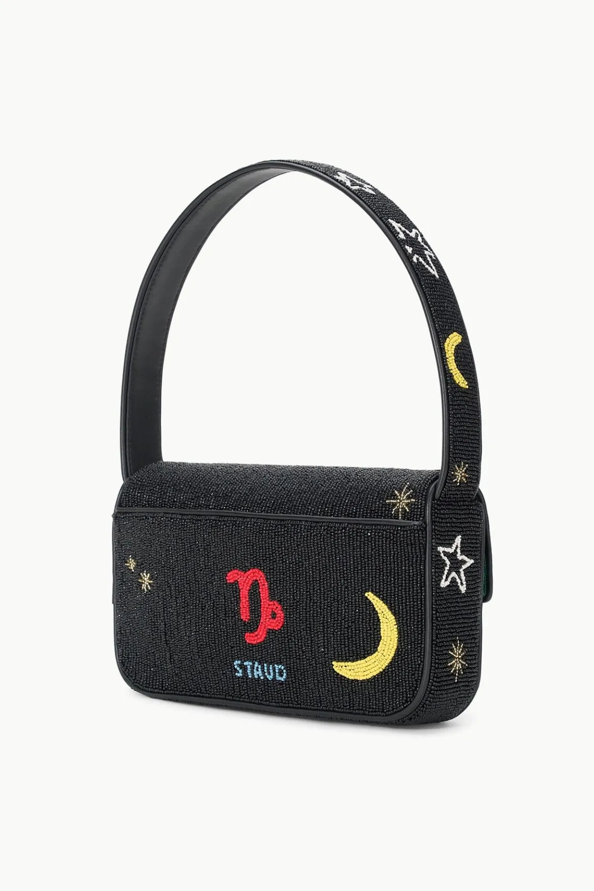 Twelve new beaded Tommy bags inspired by the star signs of the zodiac. This style is hand beaded and features vegan leather piping, a magnetic snap closureand has a pocket on the back.
