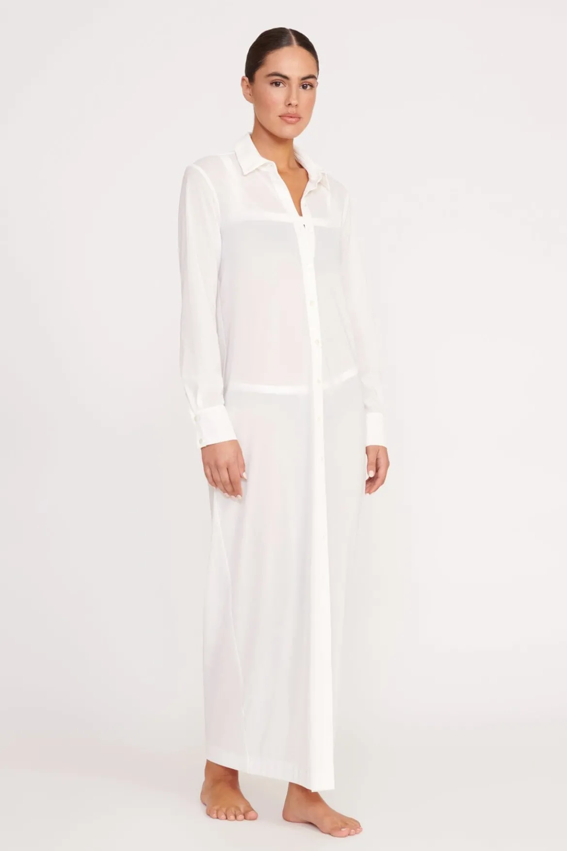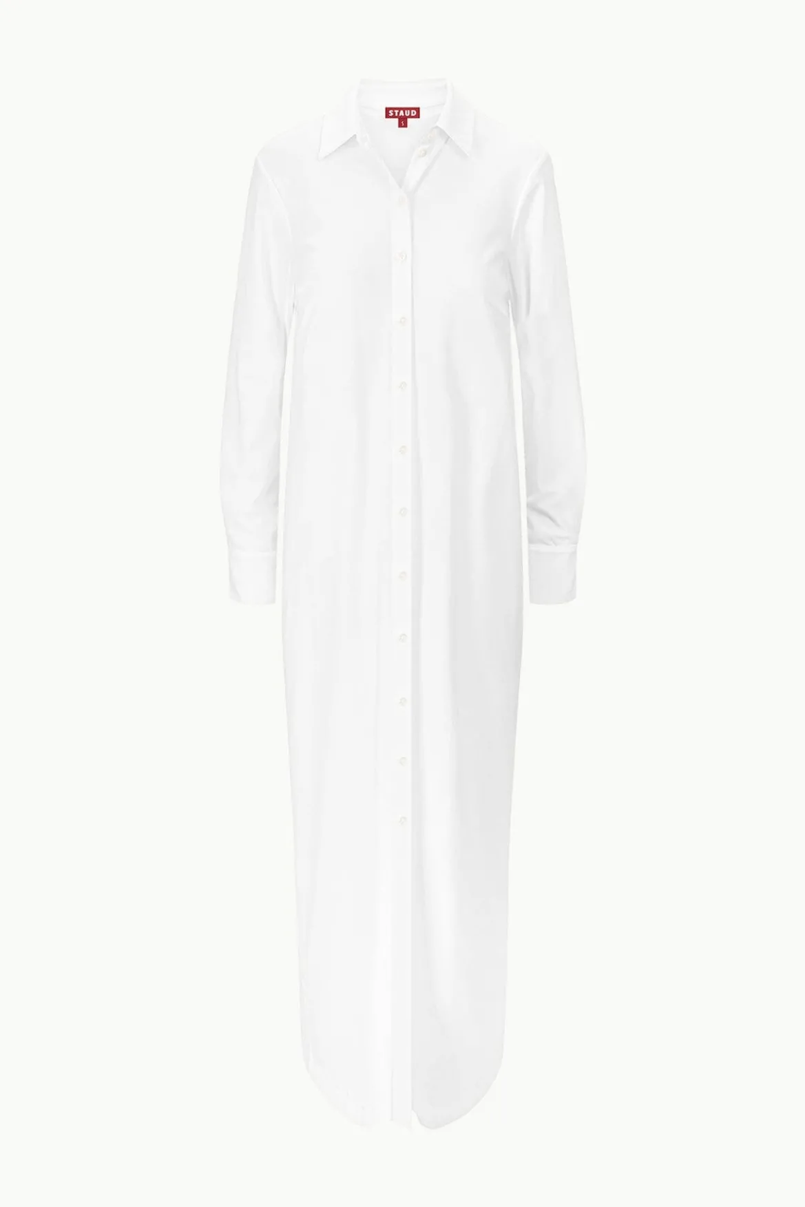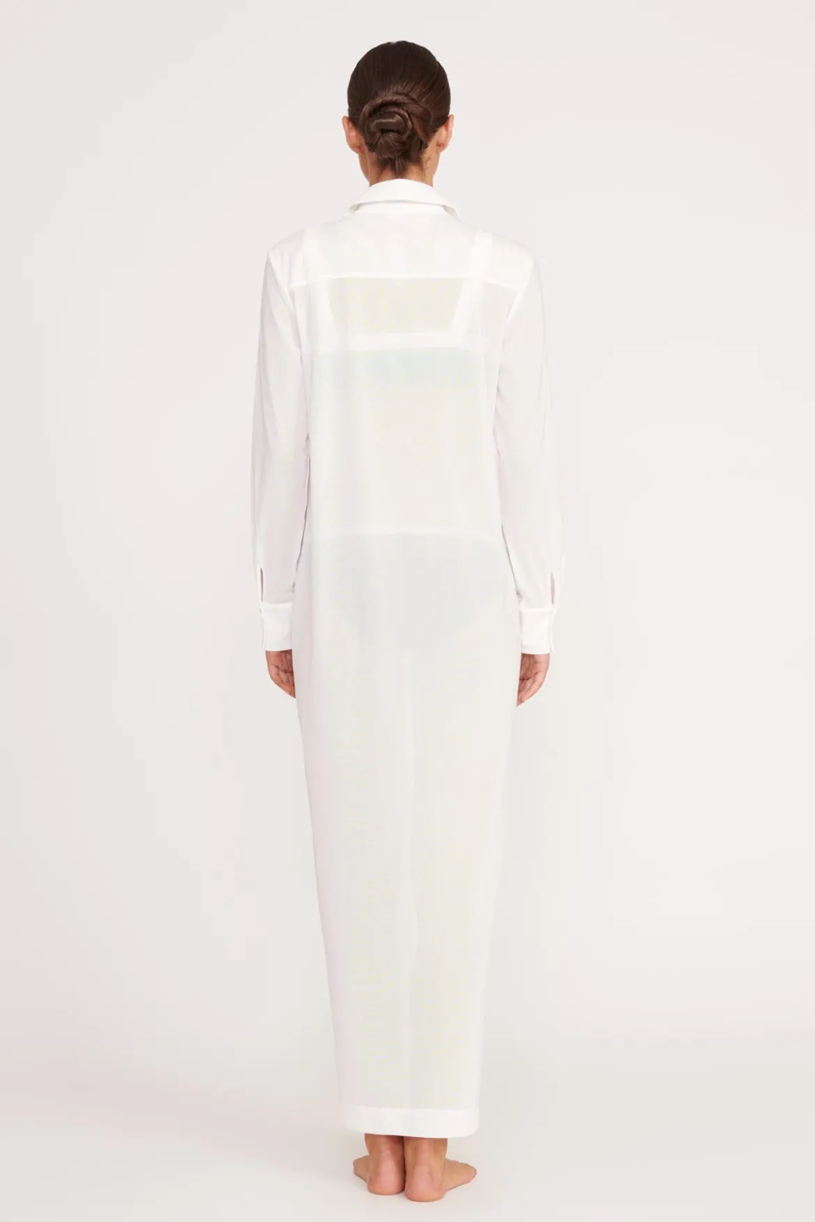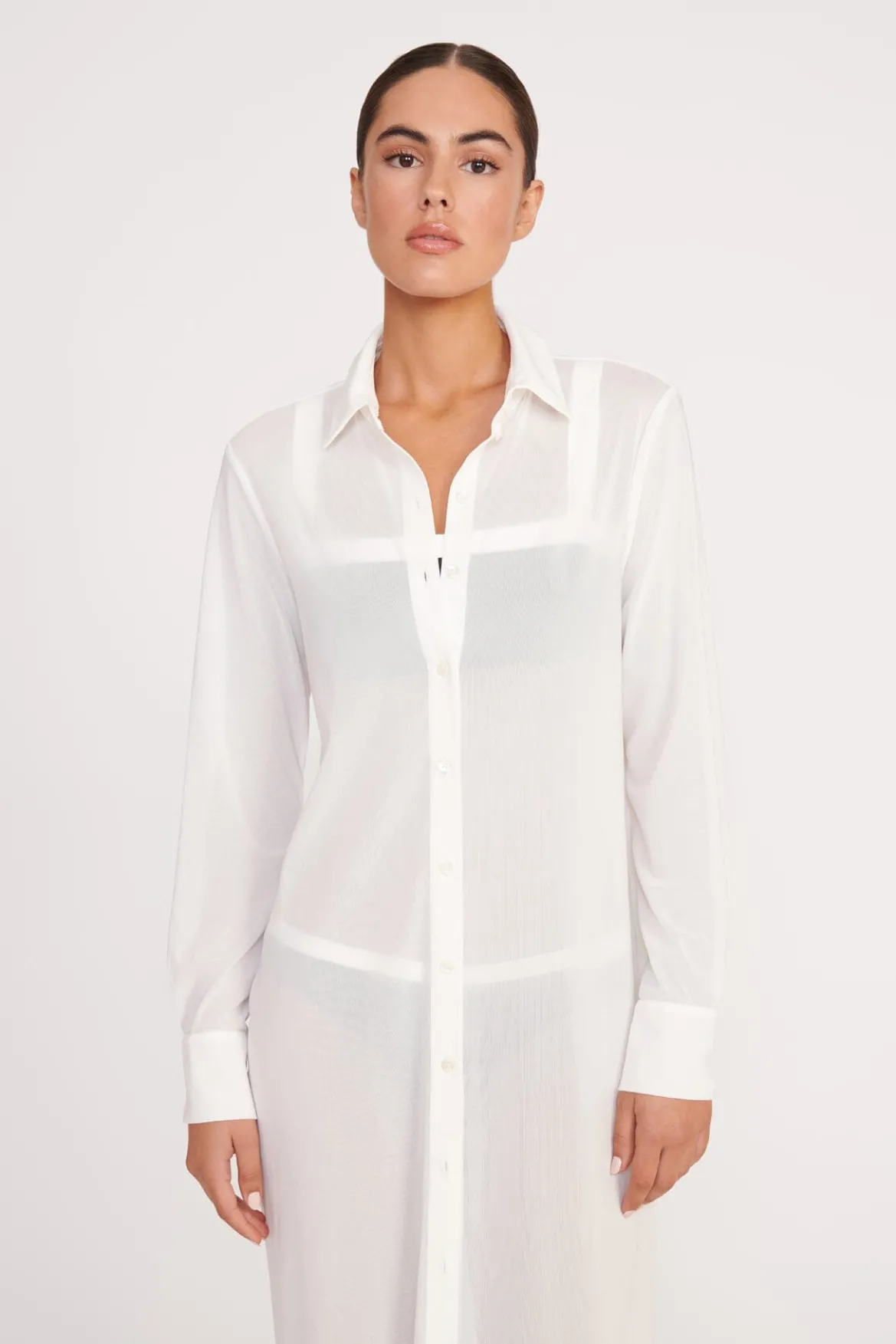 The Vita Dress is a swim coverup in our stretchy power mesh. Slightly sheer, with a button down front and a straight fit; this style pairs well with STAUD SEA swimwear.