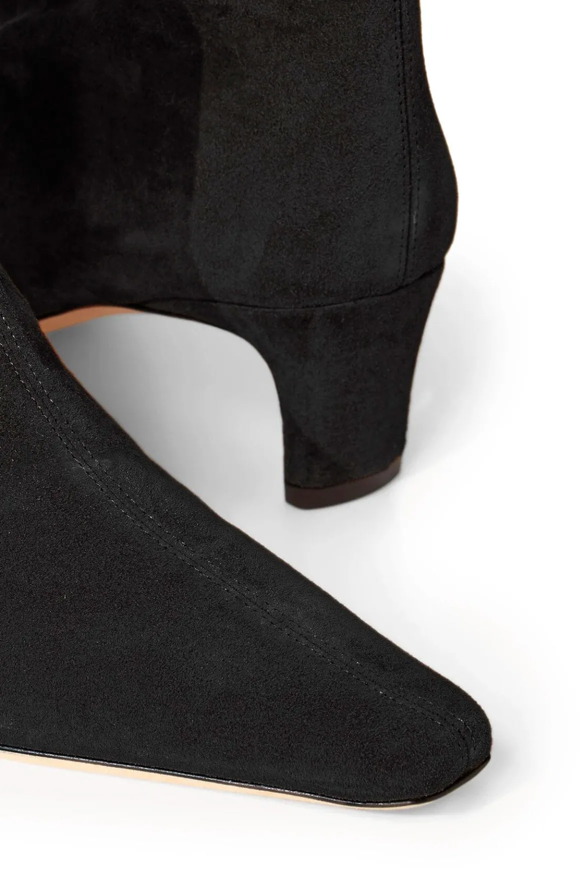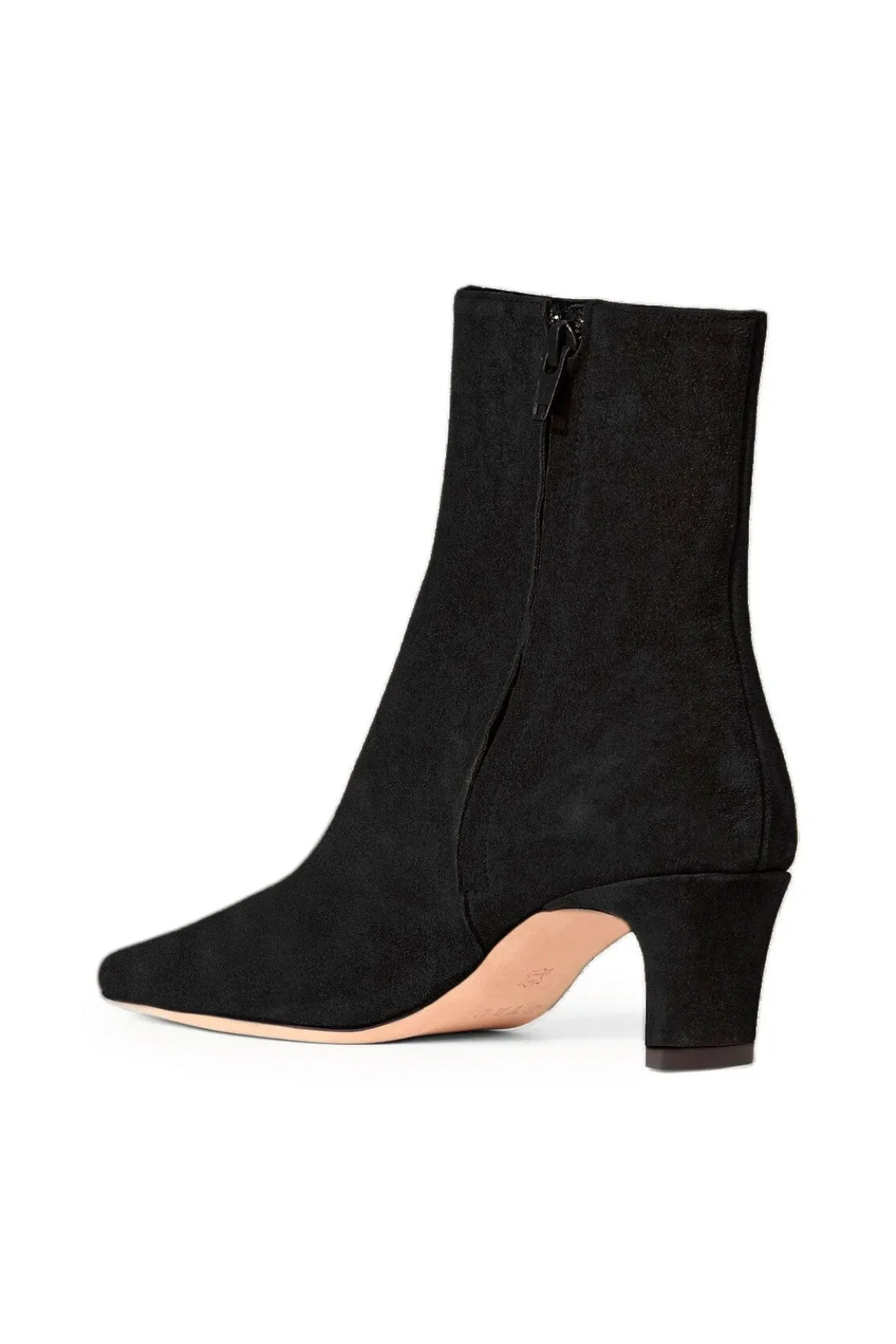 A suede ankle boot, this style features a pointed rectangular toe and a blade heel. The Wally Ankle boot features a side zip closure.