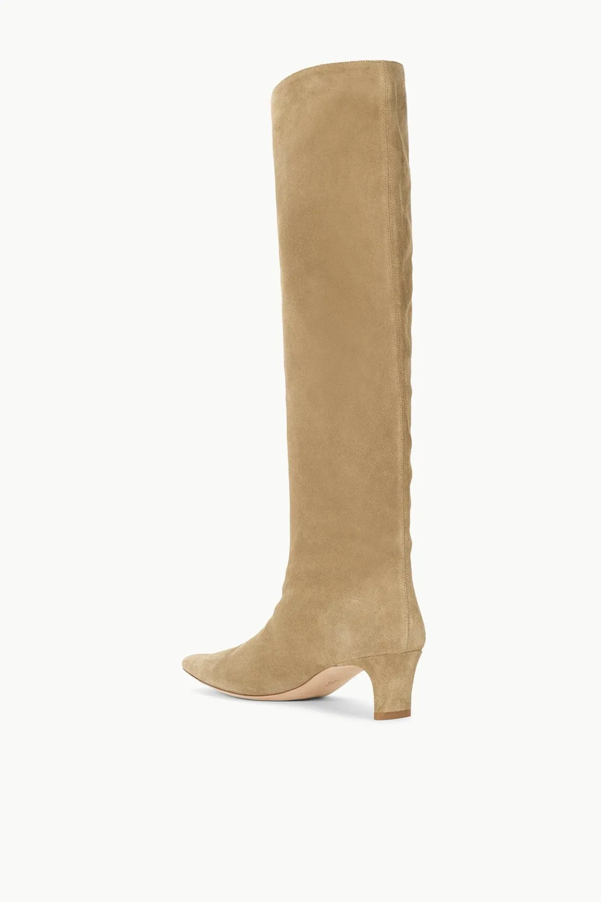 The Wally is a slouchy, suede knee-high boot featuring a pointed toe and a slim heel design.