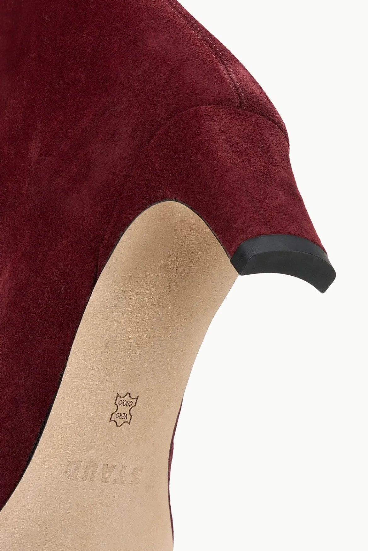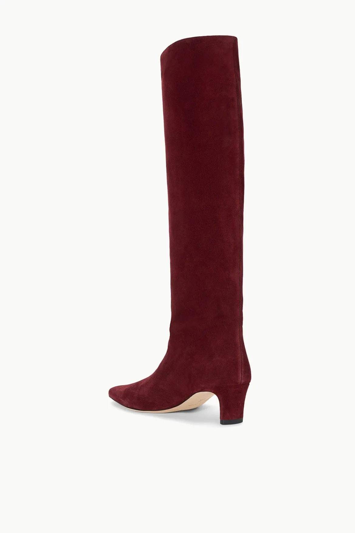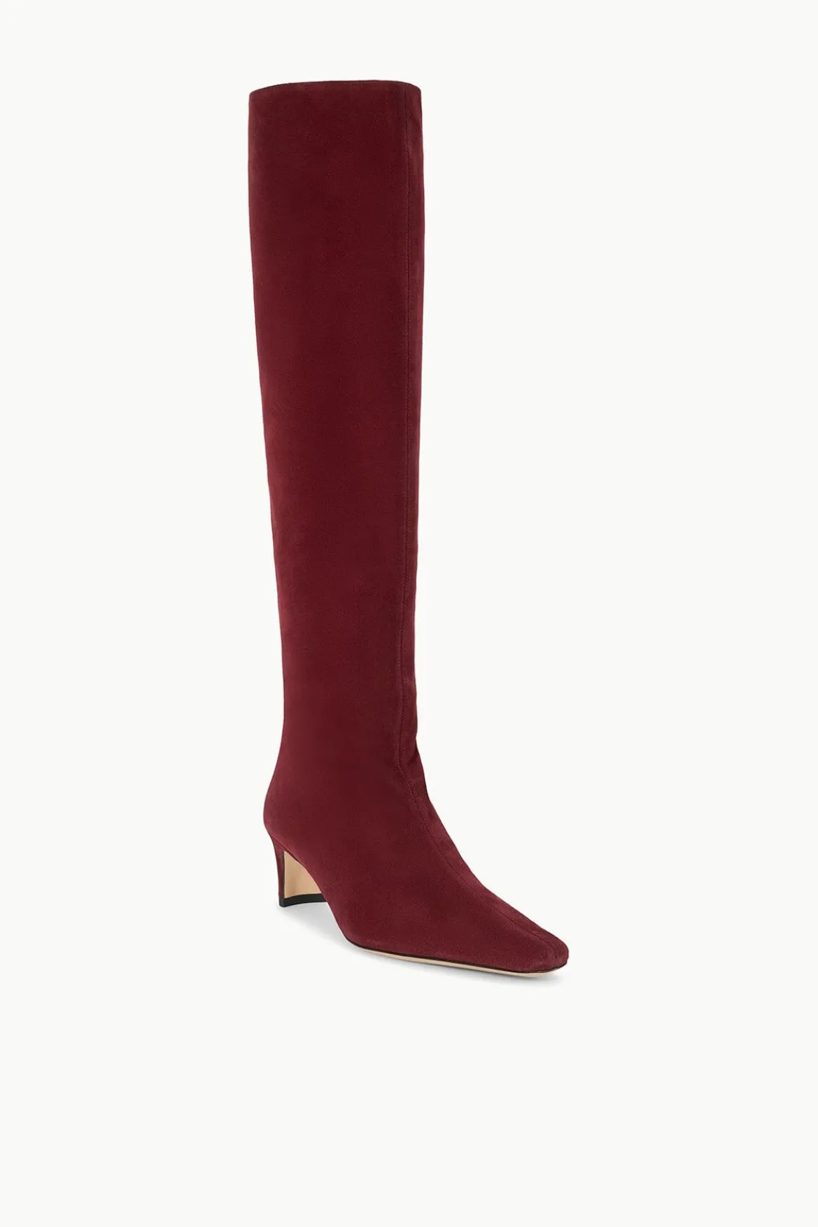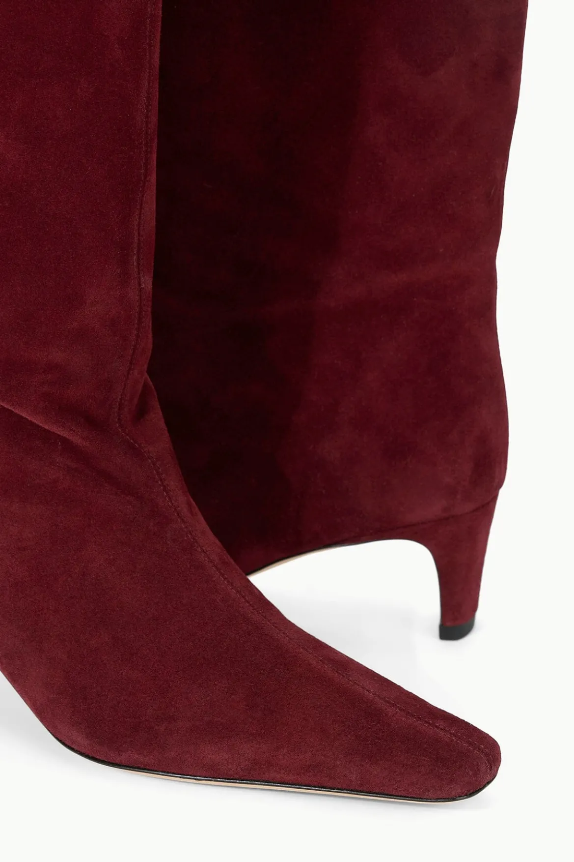 The Wally is a slouchy, suede knee-high boot featuring a pointed toe and a slim heel design.