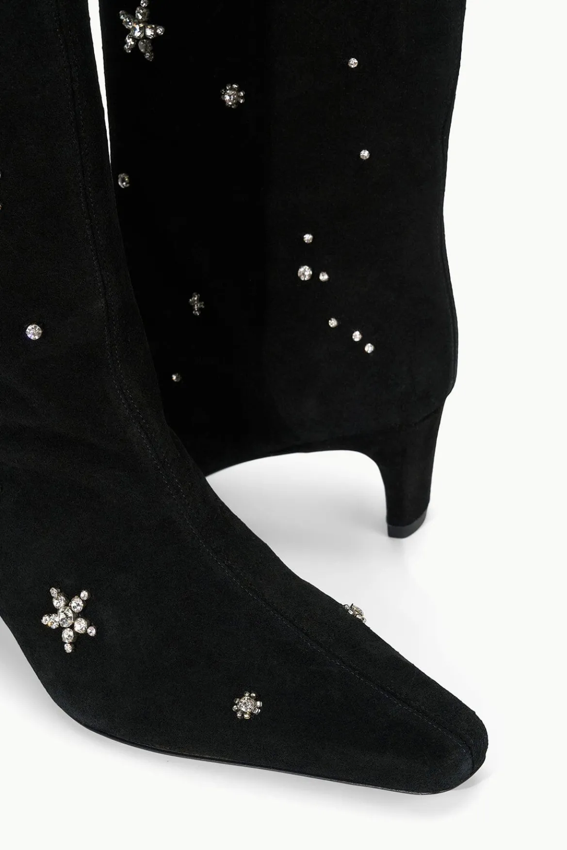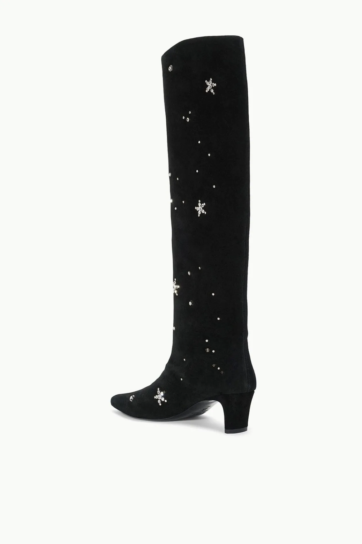 The Wally is a suede knee-high boot featuring a pointed toe and a slim heel design. Updated with an allover beaded star motif to match back to our best-selling Le Sable Dress.