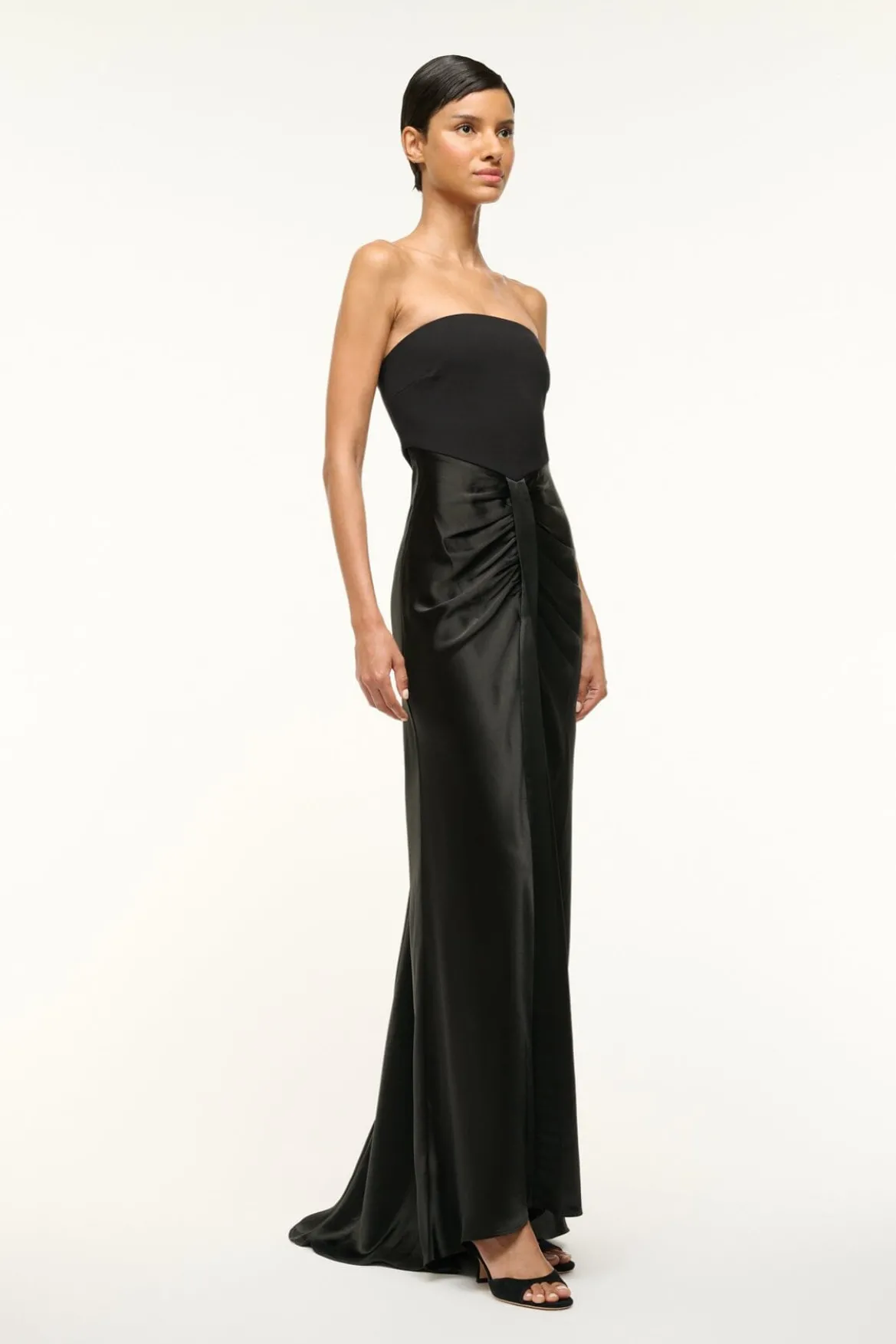 The Wayfaring Dress is a timeless evening gown with a ponte bodice and a ruched satin skirt. This strapless dress features a strapless bra-friendly bodice, with an open lower back.