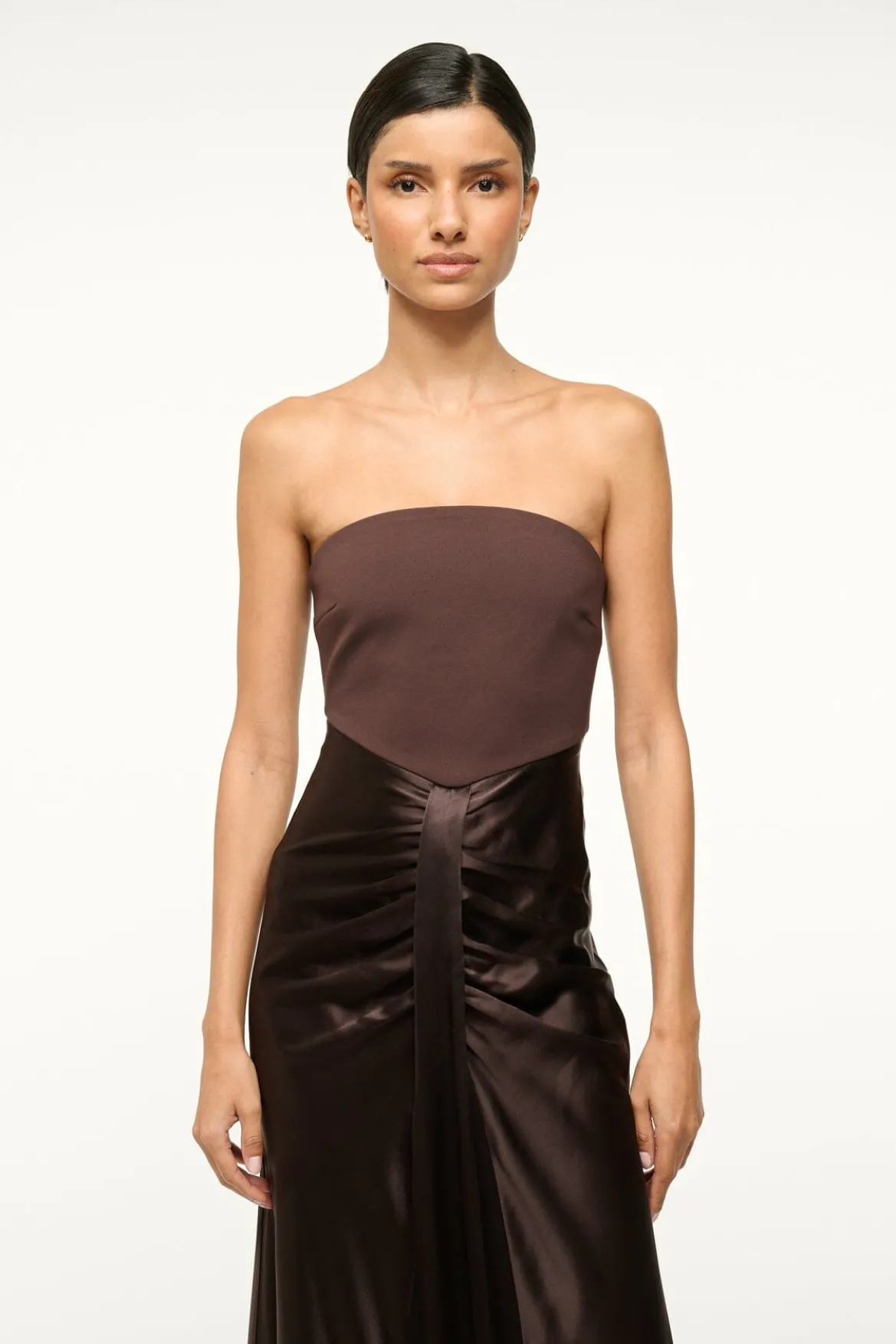 The Wayfaring Dress is a timeless evening gown with a ponte bodice and a ruched satin skirt. This strapless dress features a strapless bra-friendly bodice, with an open lower back.