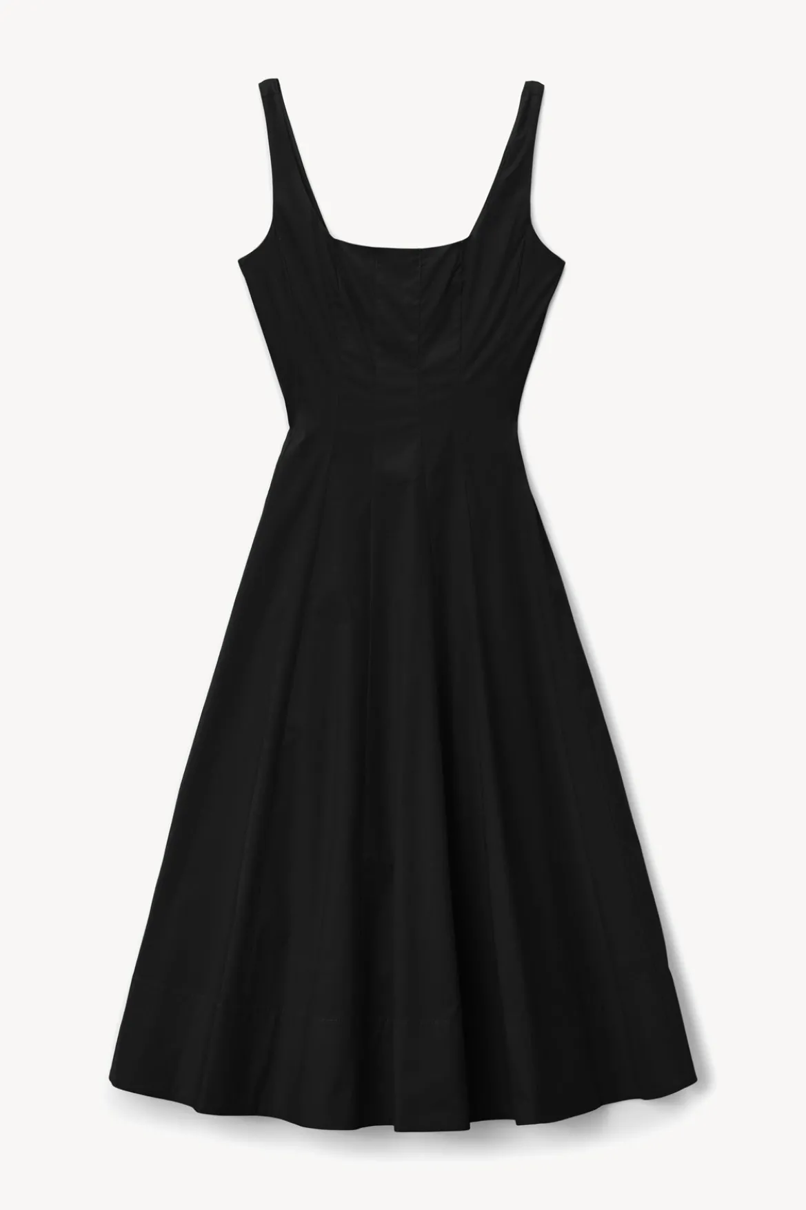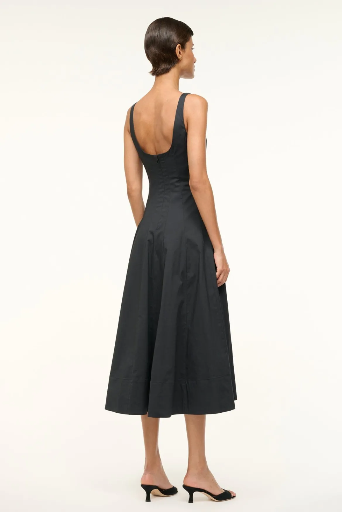 The Wells Dress features a corset-style panel construction to create a flattering, fitted shape through the waist and a midi length a-line skirt. Made out of lightweight cotton poplin.