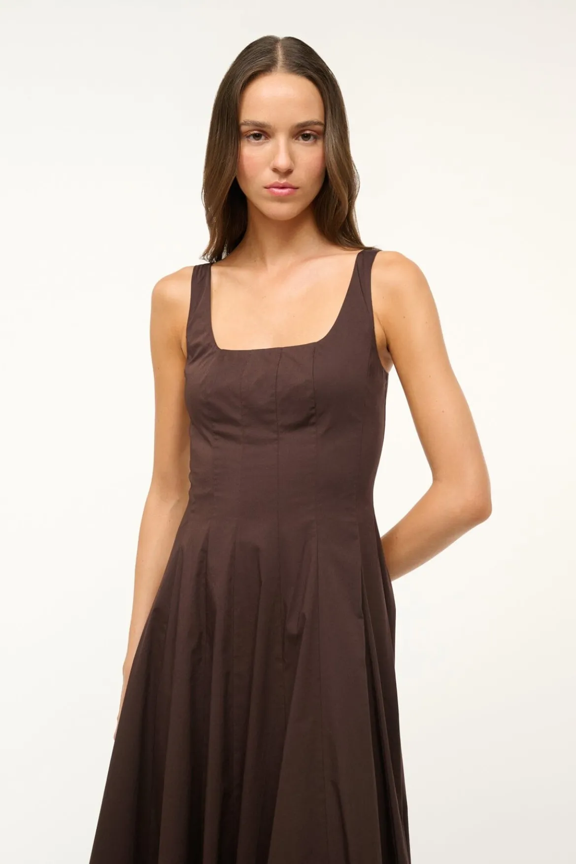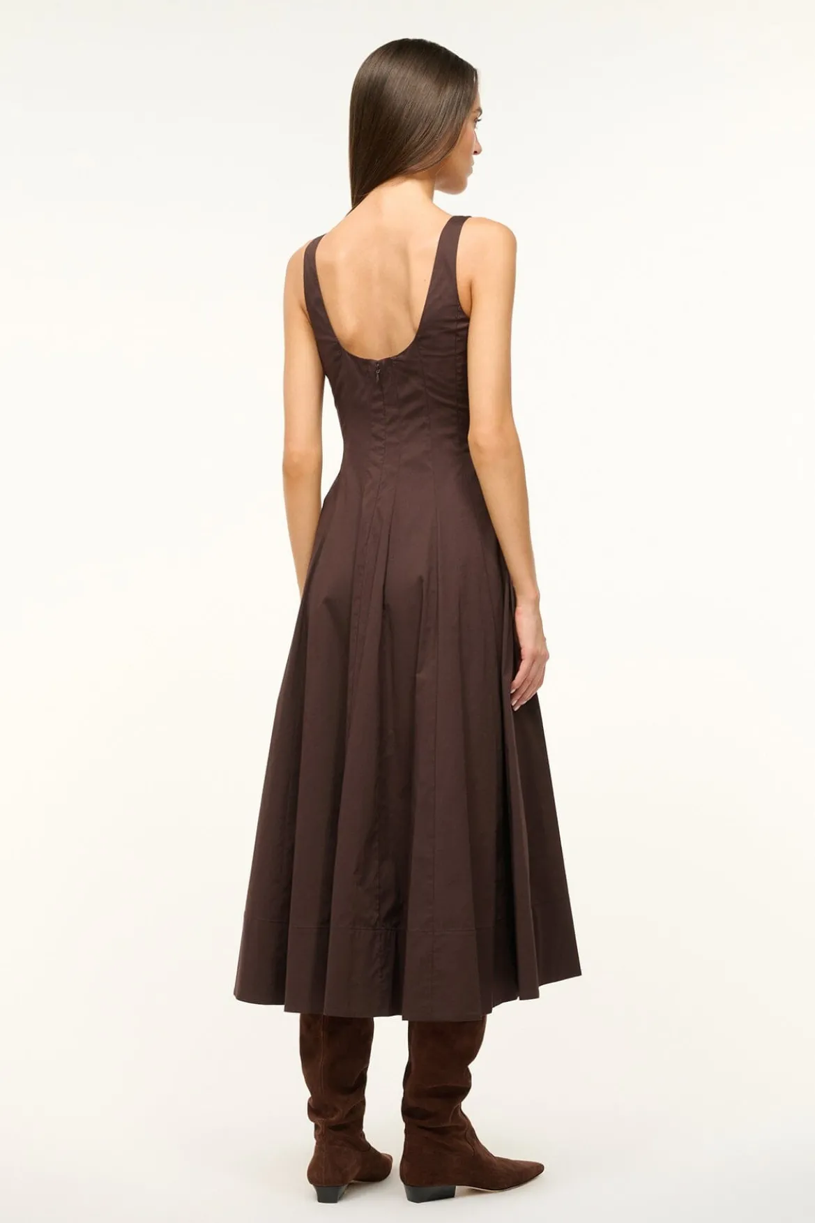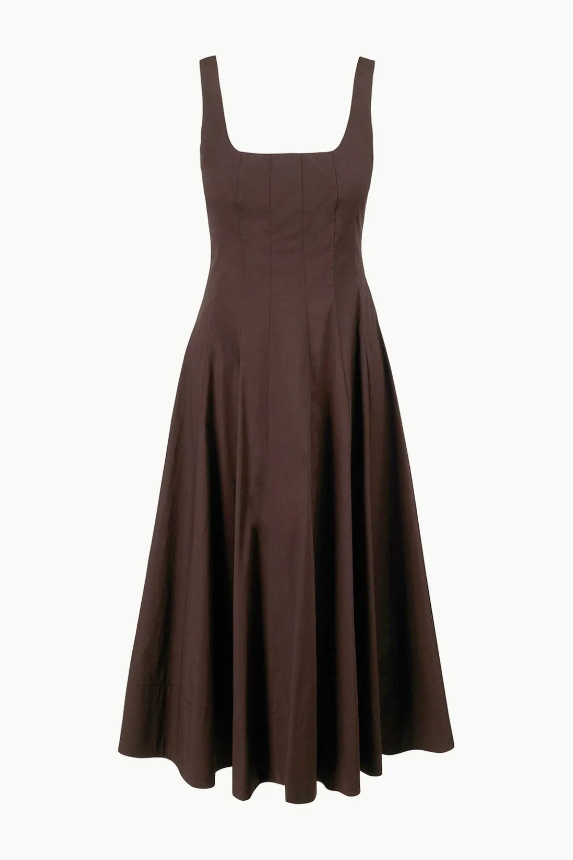 The Wells Dress features a corset-style panel construction to create a flattering, fitted shape through the waist and a full skirt which hits just below the knee. Constructed in lightweight cotton poplin.