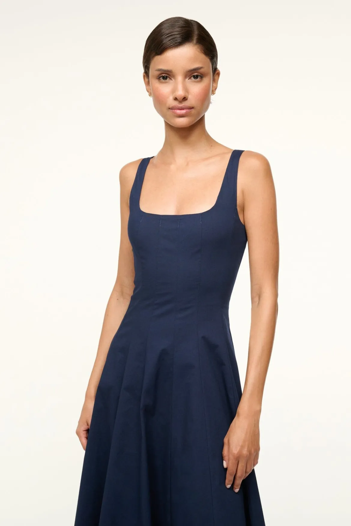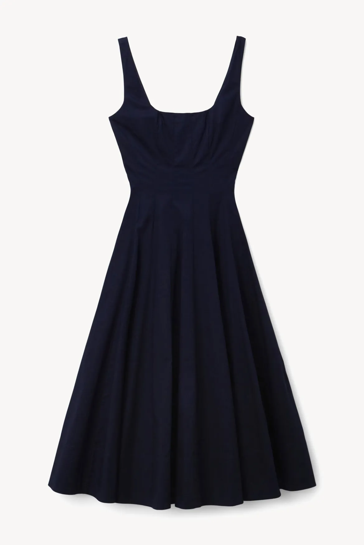The Wells Dress features a corset-style panel construction to create a flattering, fitted shape through the waist and a midi length a-line skirt. Made out of lightweight cotton poplin.