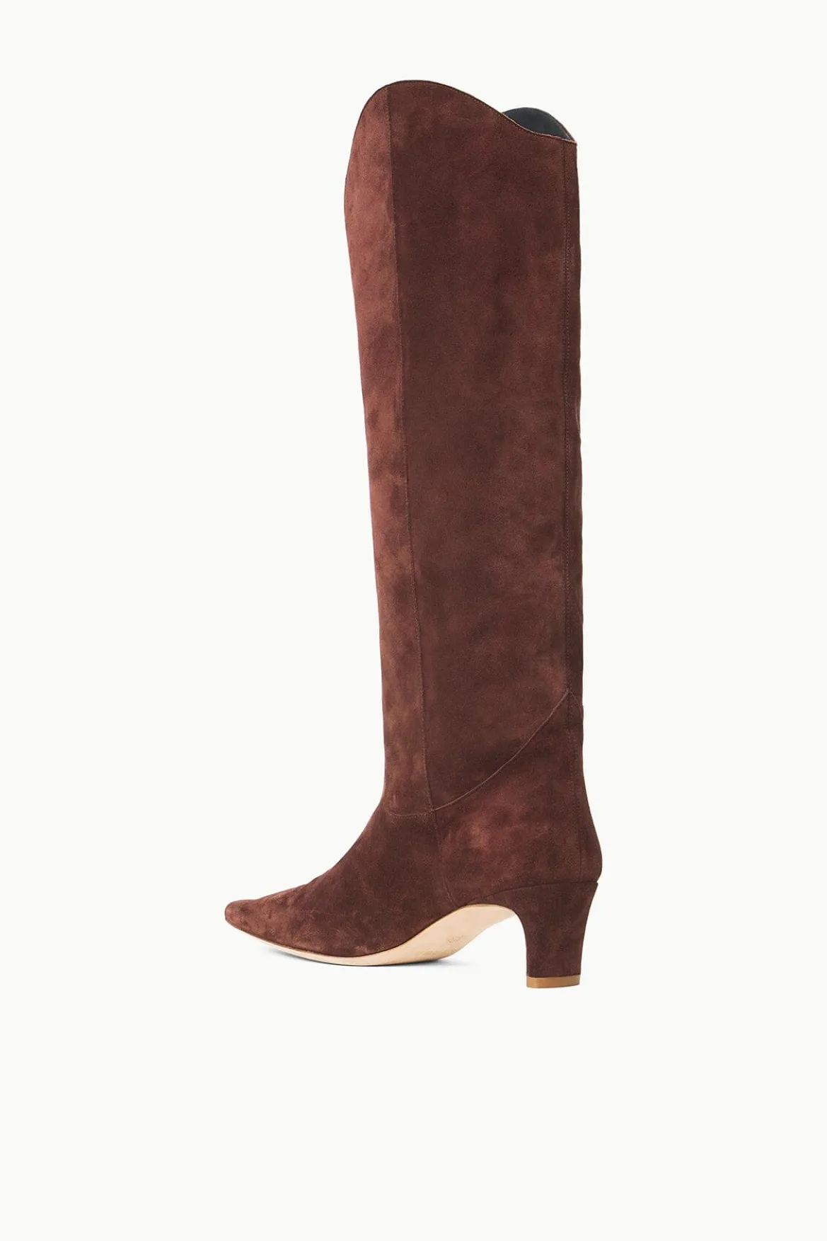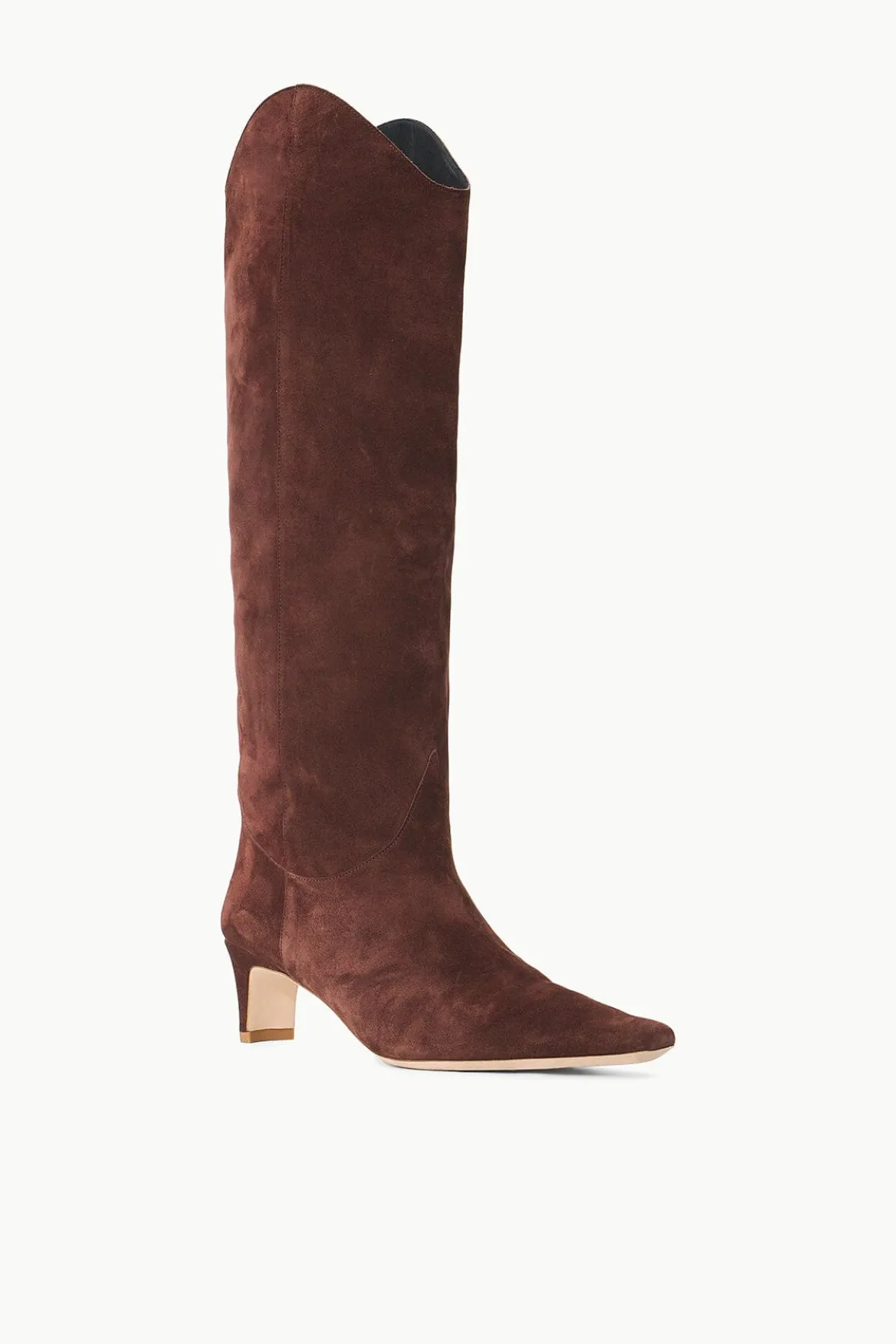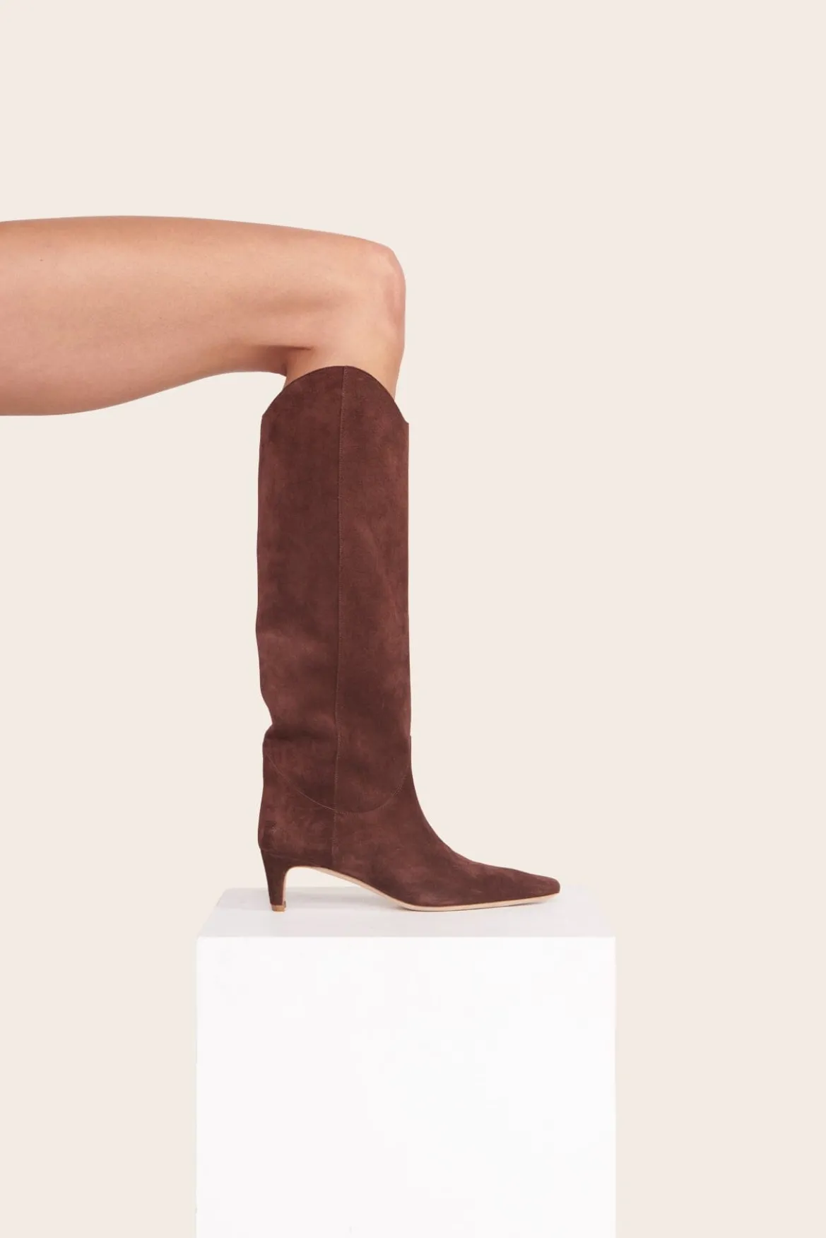 Our signatureWallyBootwith a Western inspiredcurved topline. This style features the classic Wally blade heel and pointed toe.