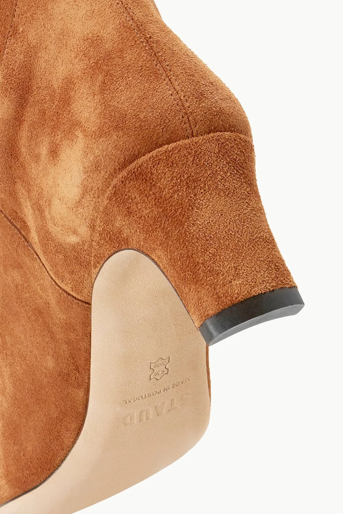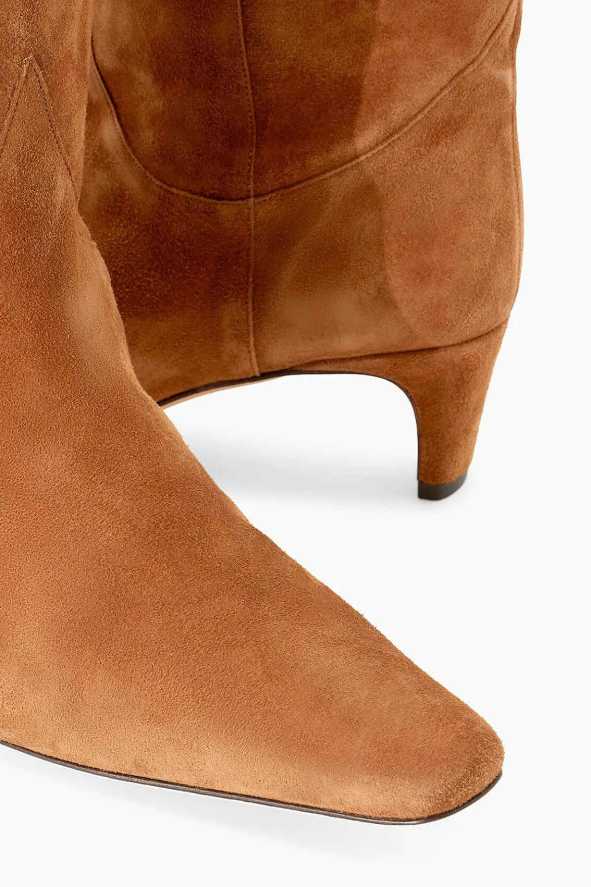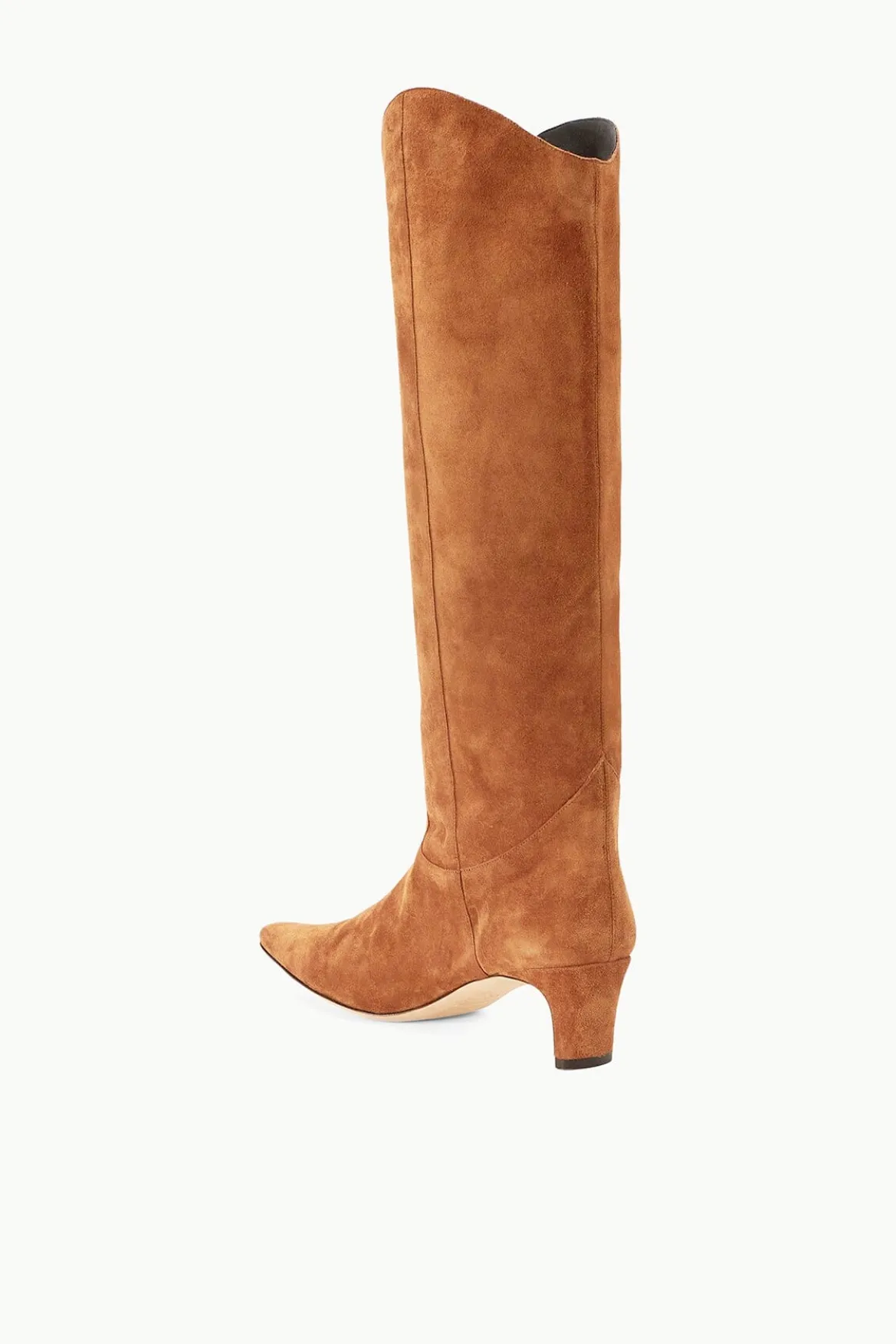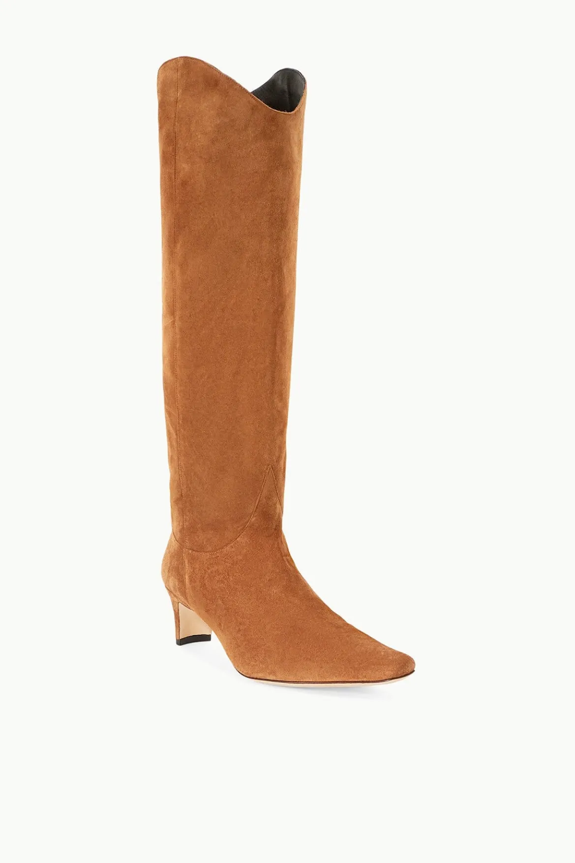 Our signatureWallyBootwith a Western inspiredcurved topline. This style features the classic Wally blade heel and pointed toe.