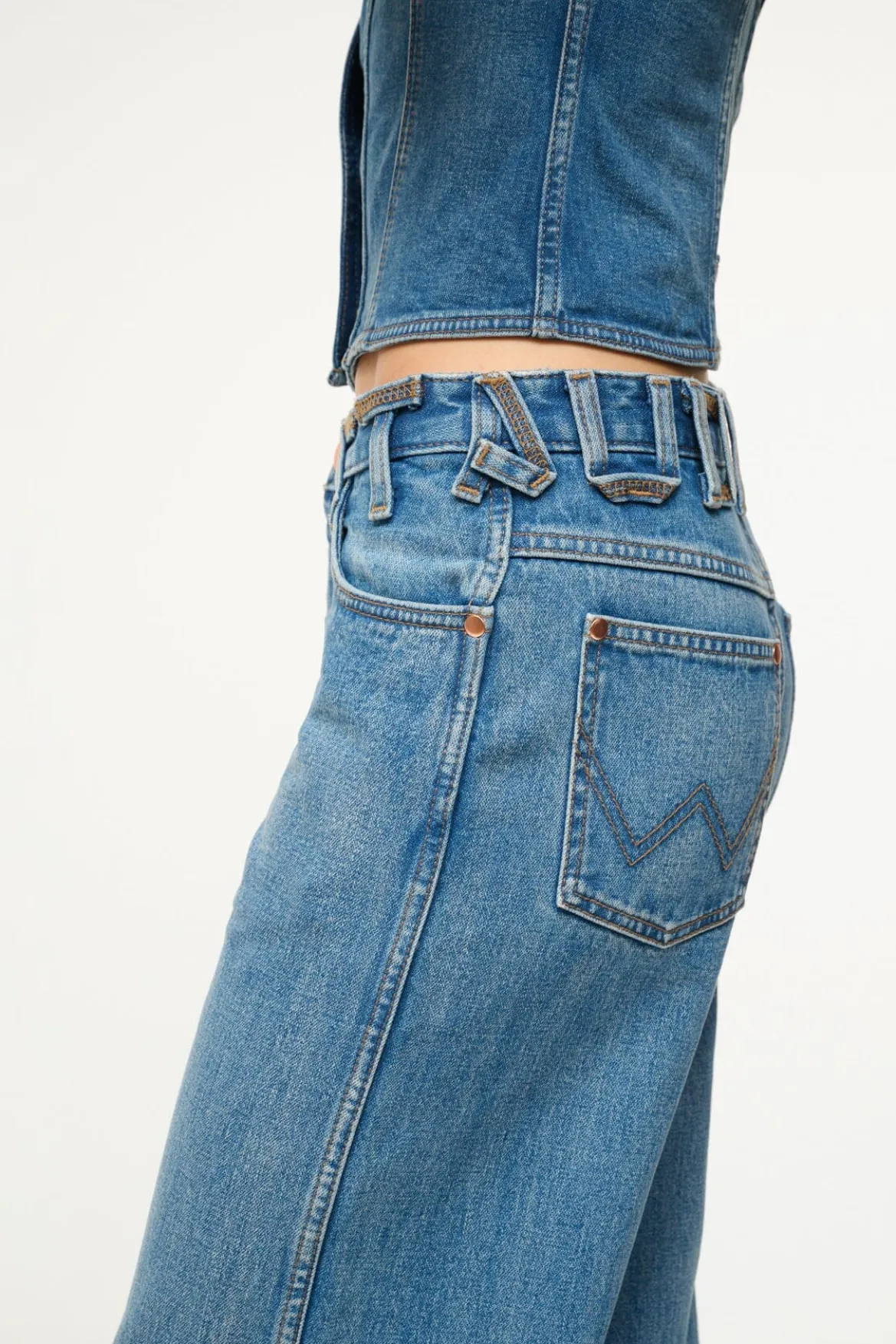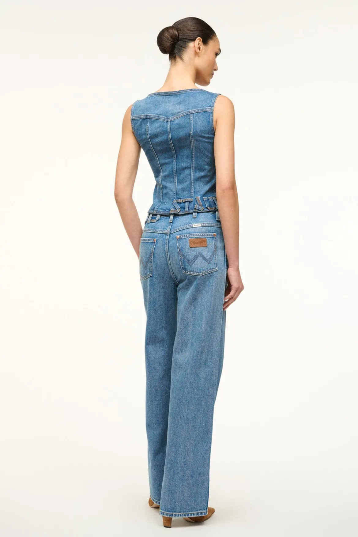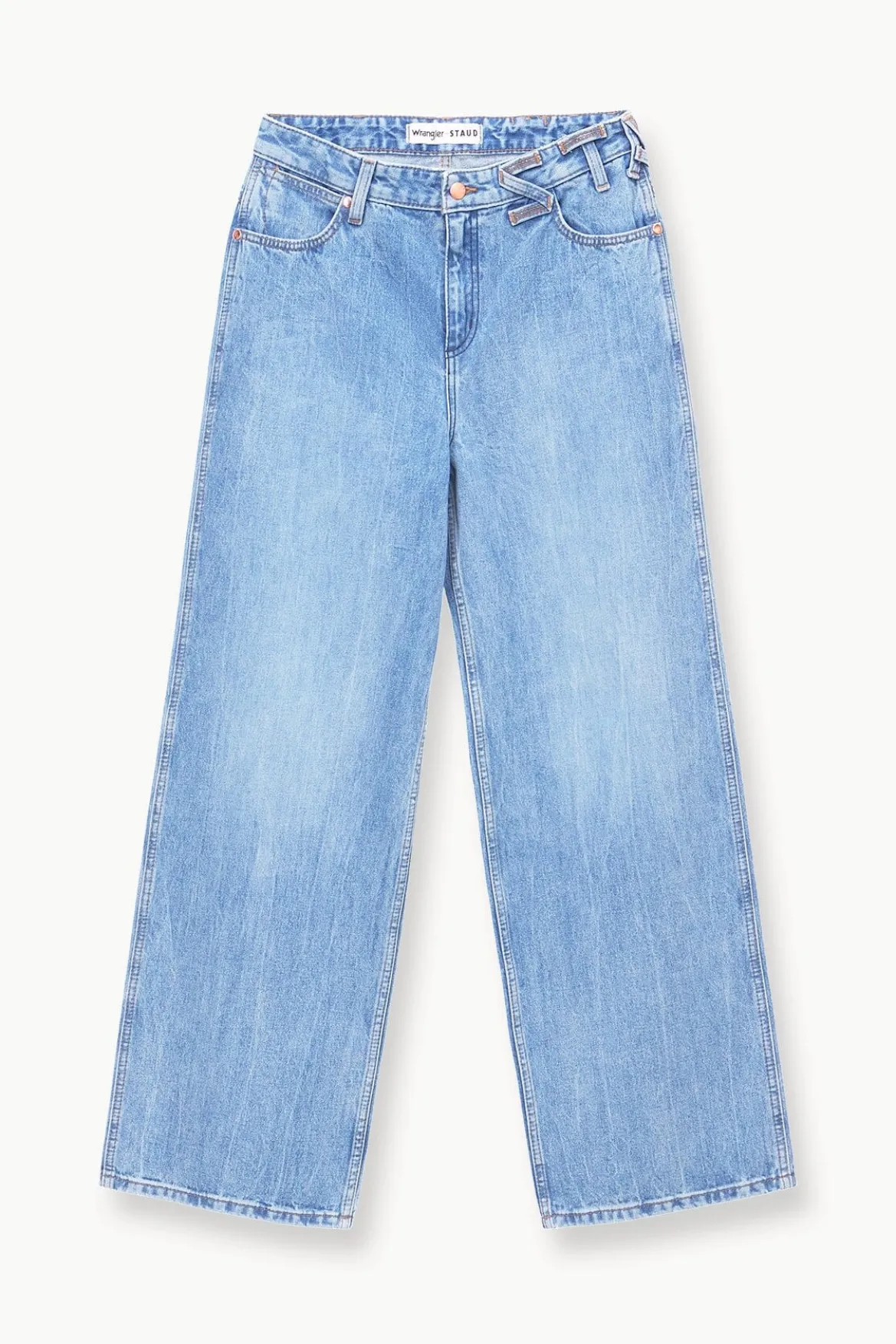 The Loose Jean is our ultra-relaxed fit. This wide leg jean sits below the natural waist for a mid-rise fit. This style features our STAUD belt loop detail at the waist. Size down to wear as a high-rise fit.