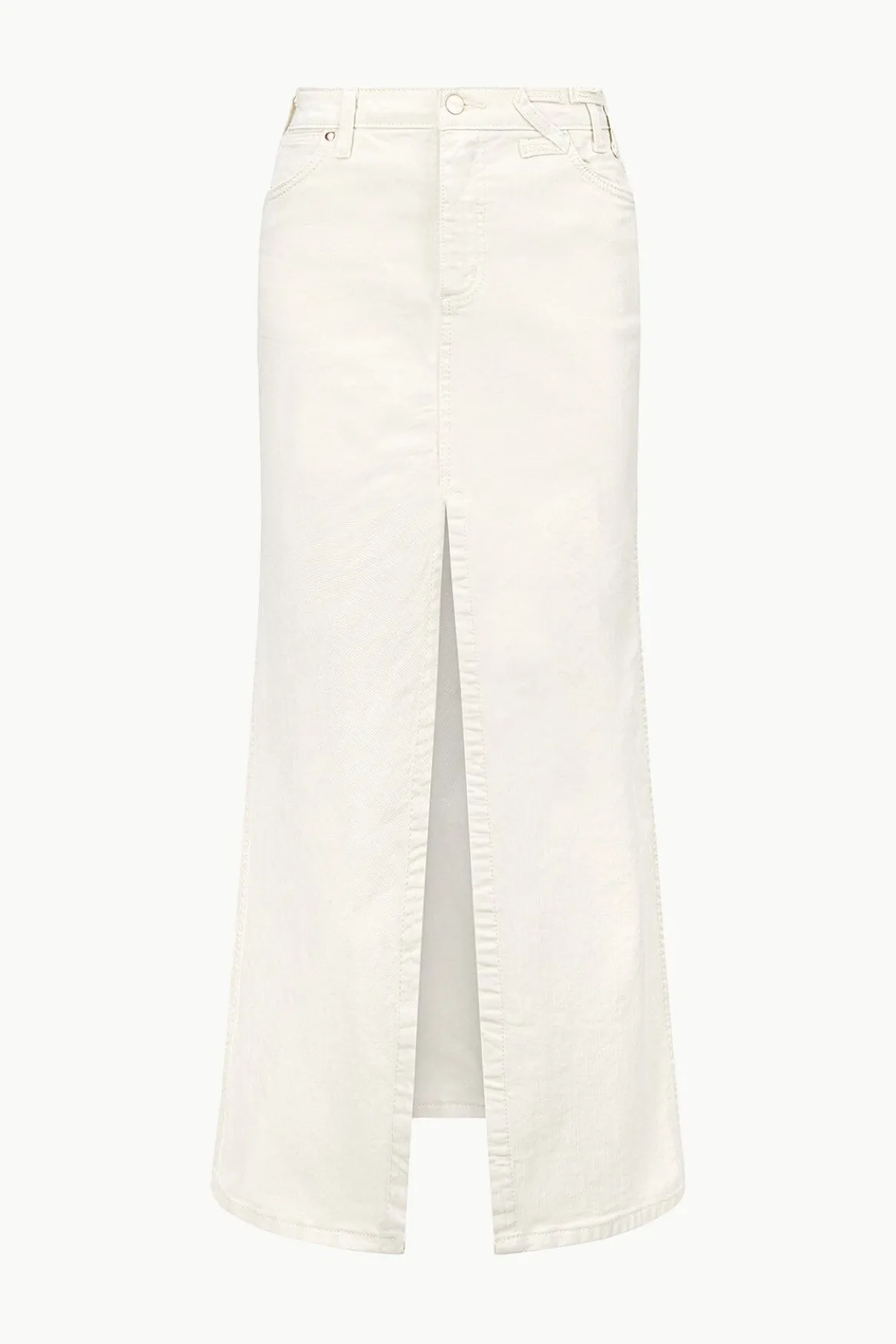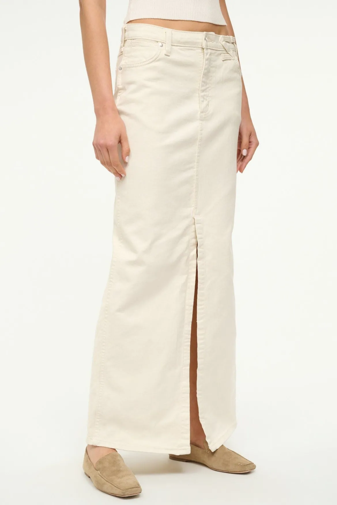 The Maxi Skirt is the full length update to our Pencil Skirt. The midrise sits just below the natural waist and has a button and zip fly closure. This style features our STAUD belt loop detail at the waist and a front slit.