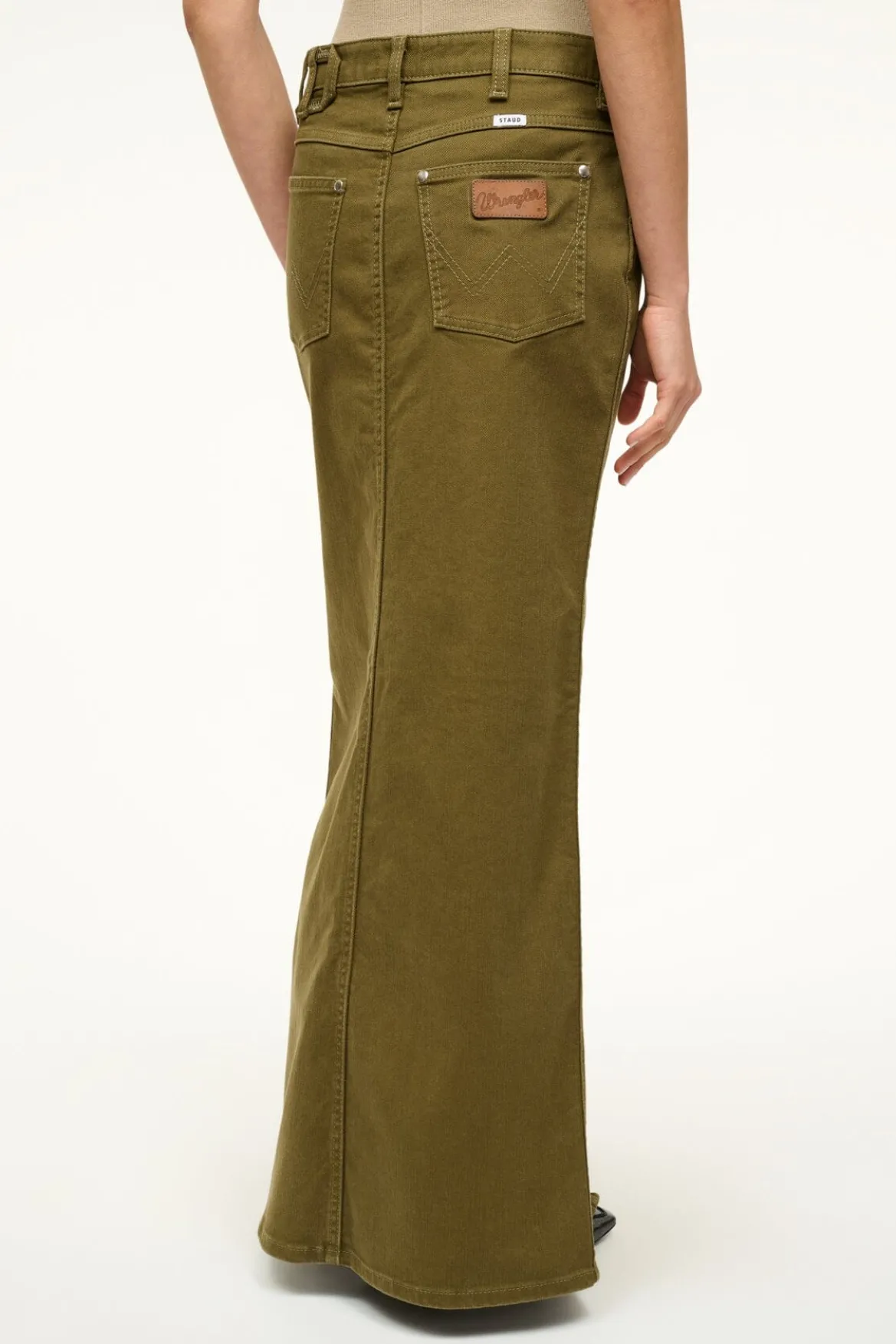 The Maxi Skirt is the full length update to our Pencil Skirt. The mid-rise sits just below the natural waist and has a button and zip fly closure. This style features our STAUD belt loop detail at the waist and a front slit.
