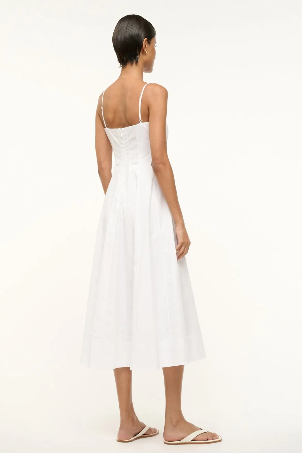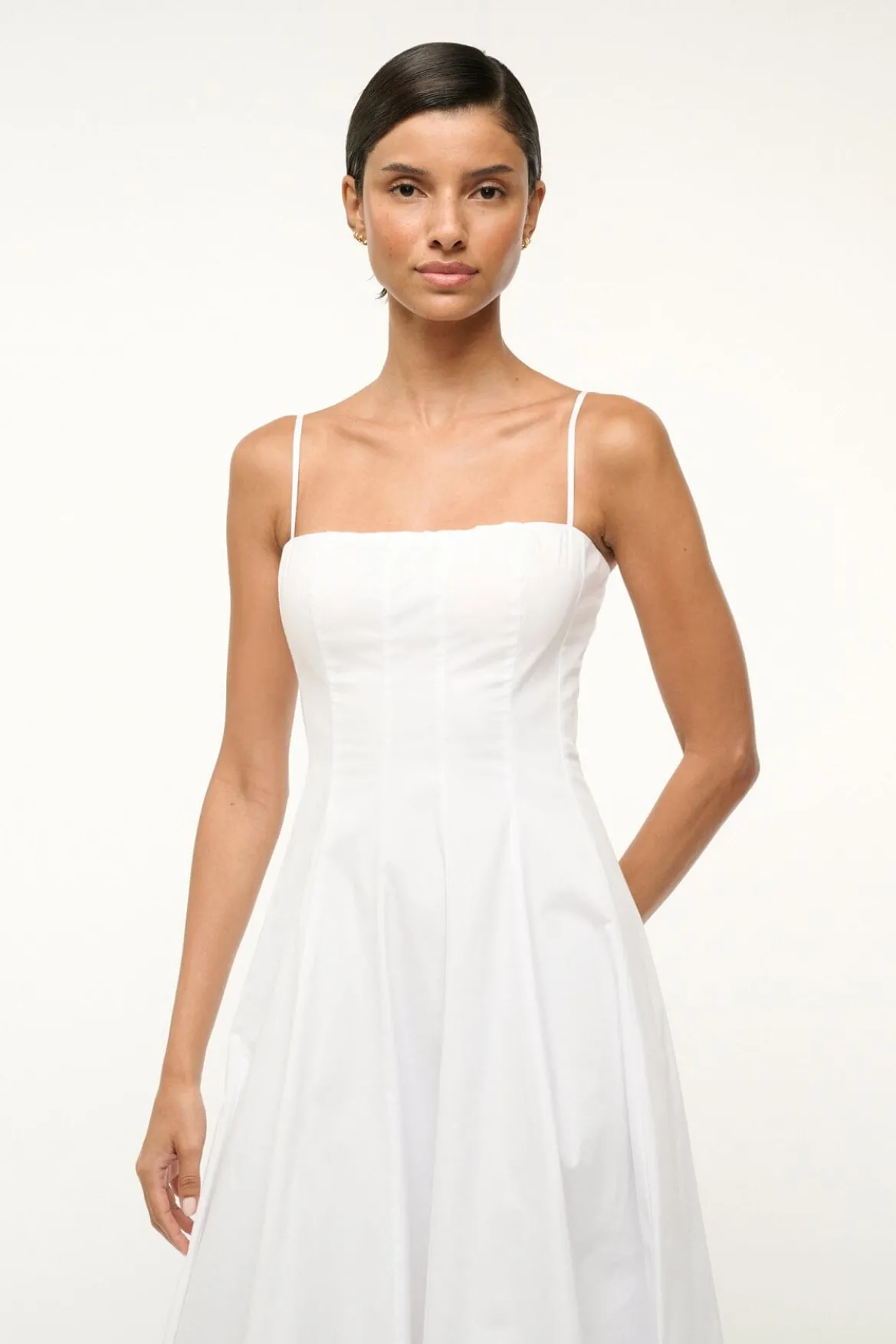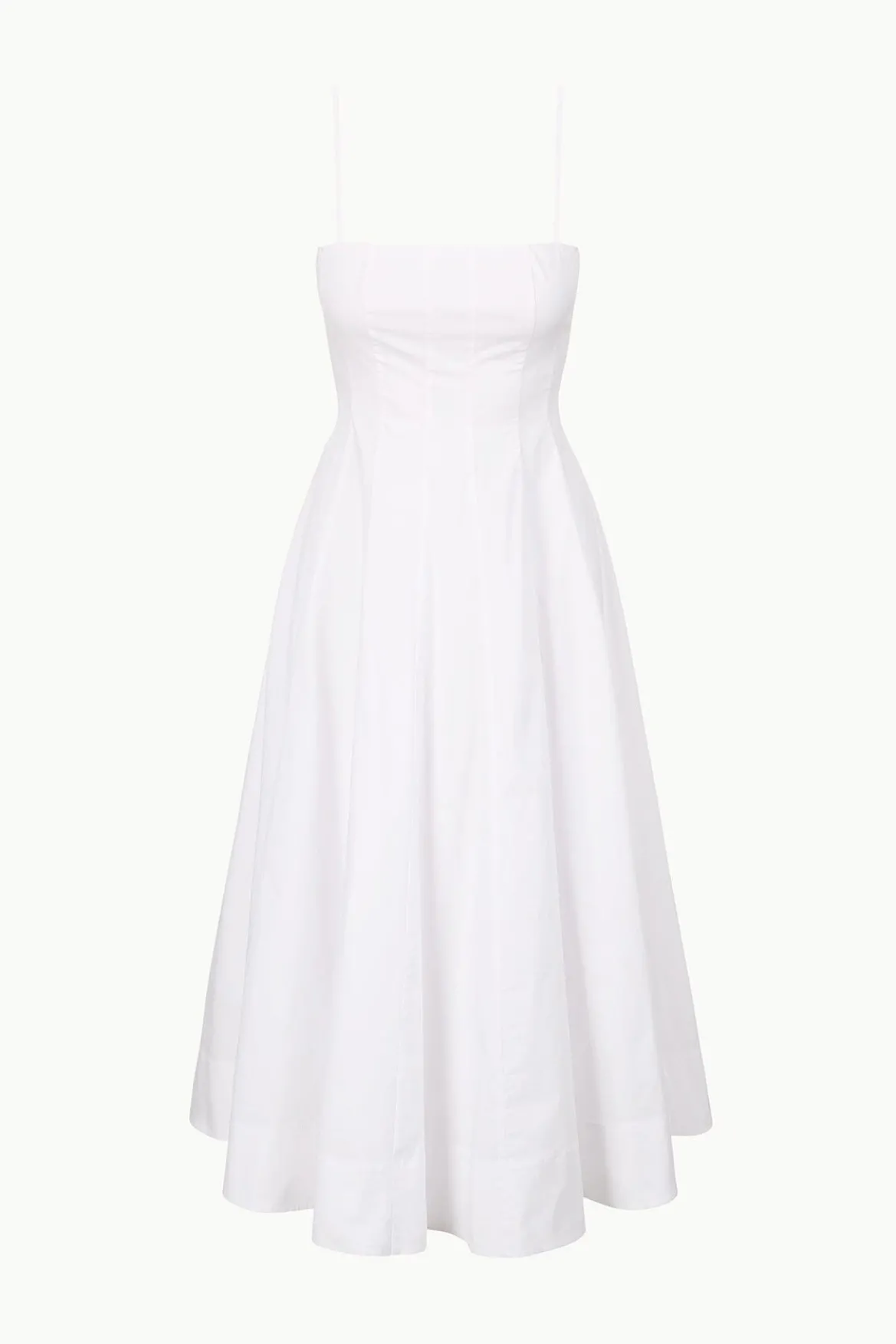 Introducing the Wylie, our newest midi dress crafted in our classic cotton poplin fabric. This style features a corset-style panel construction as seen in the Wells Dress, spaghetti straps and a straight neckline.