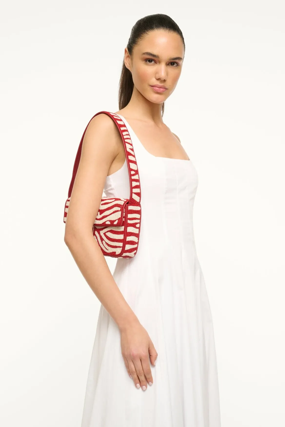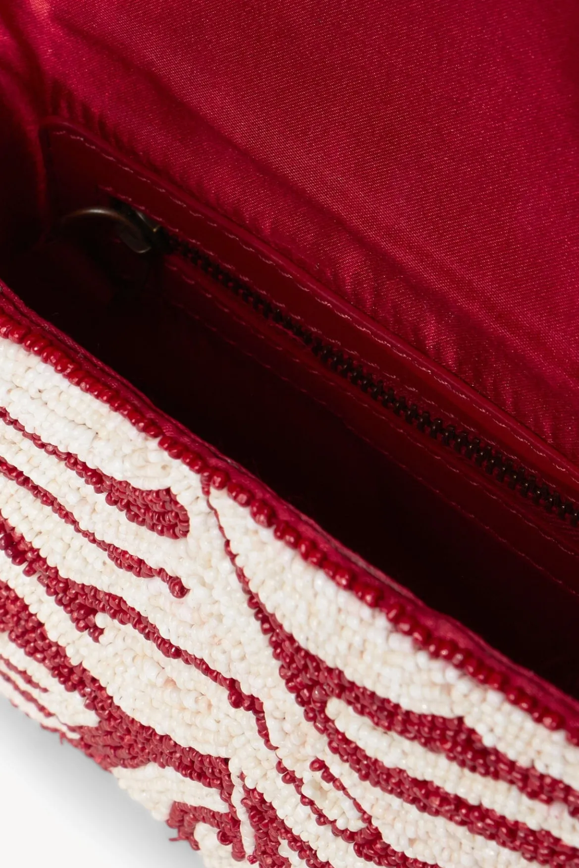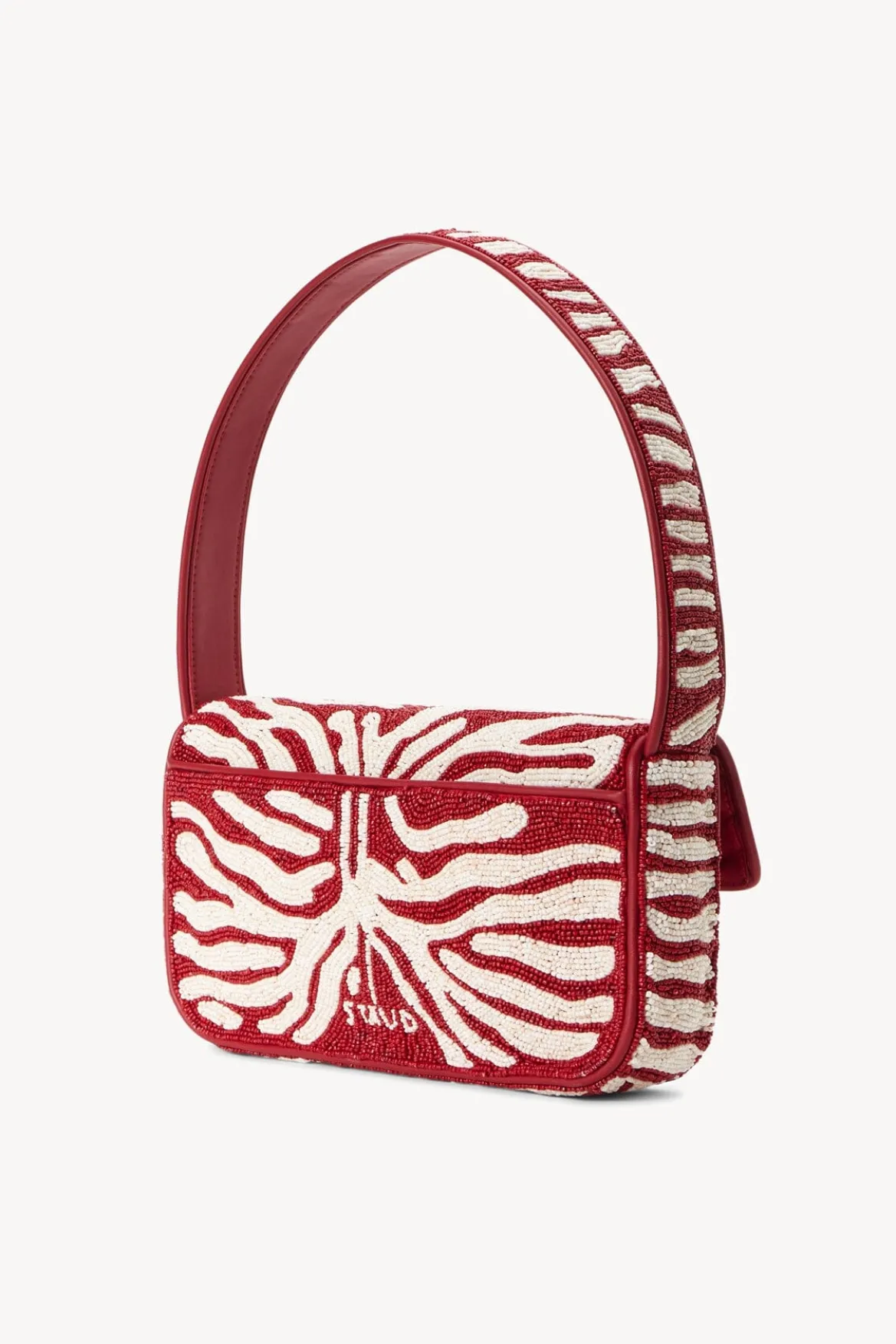 The Tommy is a hand-beaded shoulder bag with vegan leather piping. This style features a single flap closure, inner zip pouch and magnetic pocket on the back.
